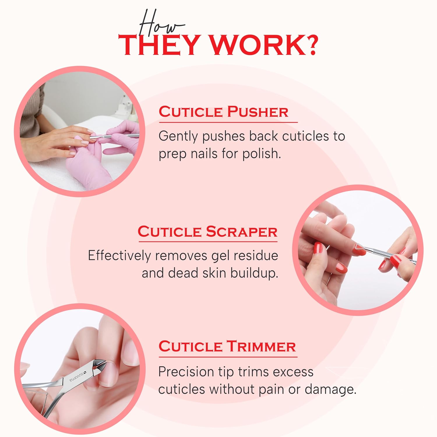 Cuticle Nippers with Cuticle Pusher, Nail Scraper and Gel Remover โ Professional Stainless Steel Cuticle Trimmer Set for Manicure - Cuticle Set for Fingernails and Dead Skin (Silver, 3 PCS)