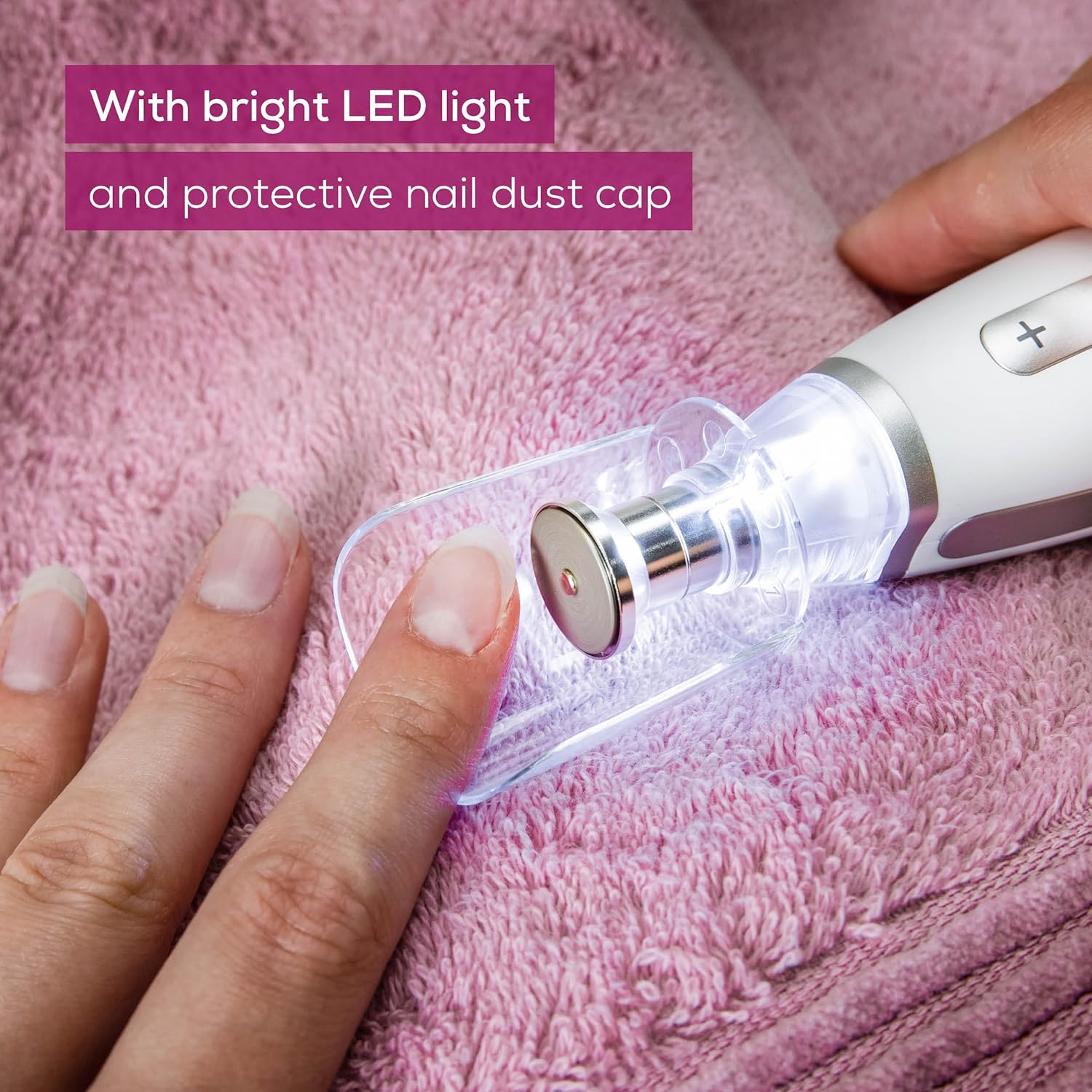 - PRECISE FILING: The integrated LED-light enables a more refined finish by illuminating the nail area β while the dust shield keeps your manicure and pedicure hygienic and mess-free