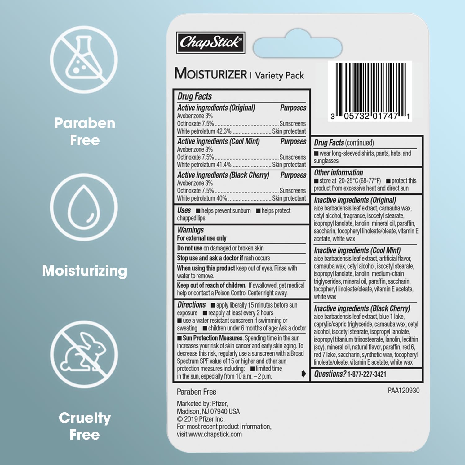 - LIP CARE WITH SUN PROTECTION: Keep your lips ultra-hydrated and protected from the sun’s rays. The ChapStick Moisturizer 2-in-1 Lipcare variety 3-pack includes Original, Black Cherry, and Cool Mint.