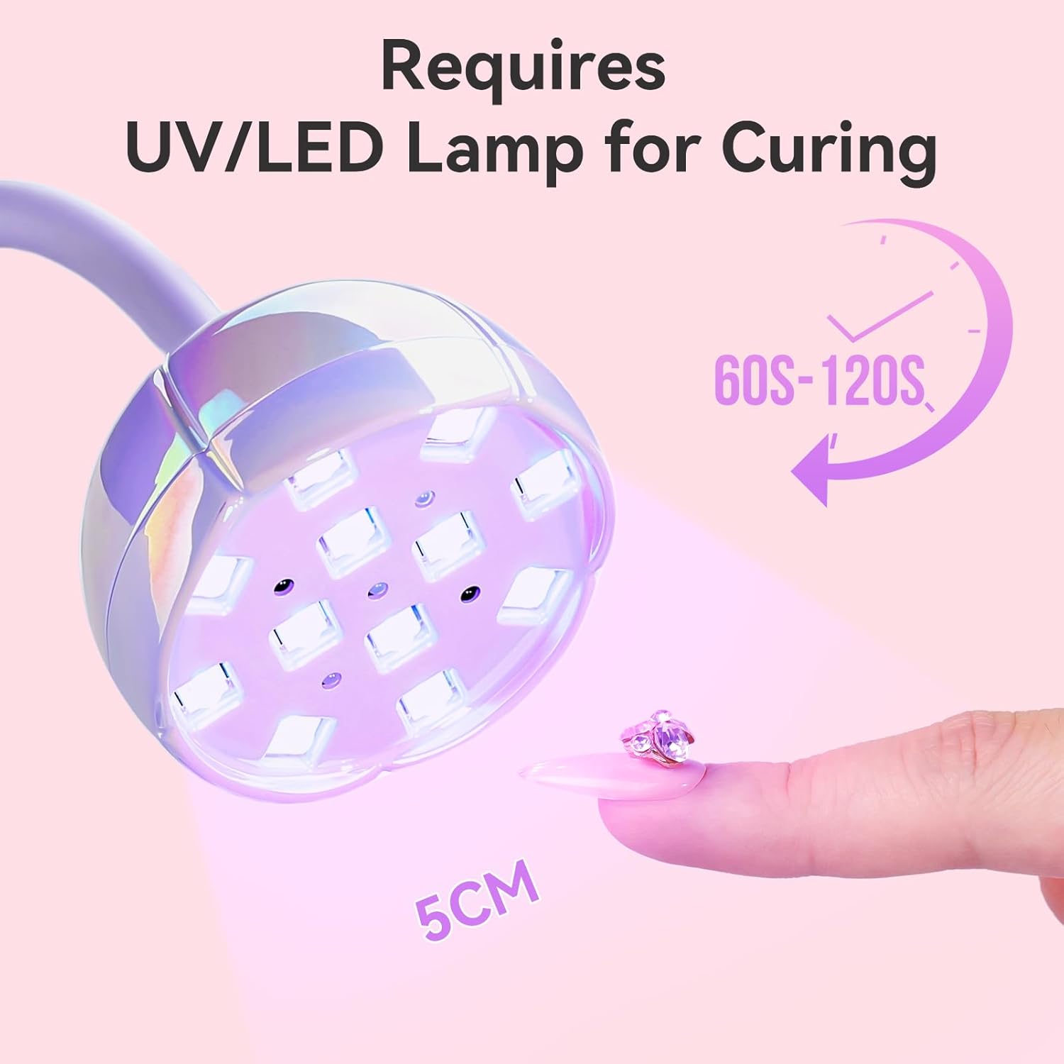 - How to Use: 1. Apply the nail crystal glue resin on the nail, 2. Put the rhinestones on, cure it for about 3 minutes(LED Lamp Requried), the time may differ for different lamps, just make sure to cure it till its completely dry, 3. For large or non-flatback rhinestones, fill a little more glue into the gap and the base to make sure its double secured, cure it with nail lamp again till its completely dry, your charms for nails are secured