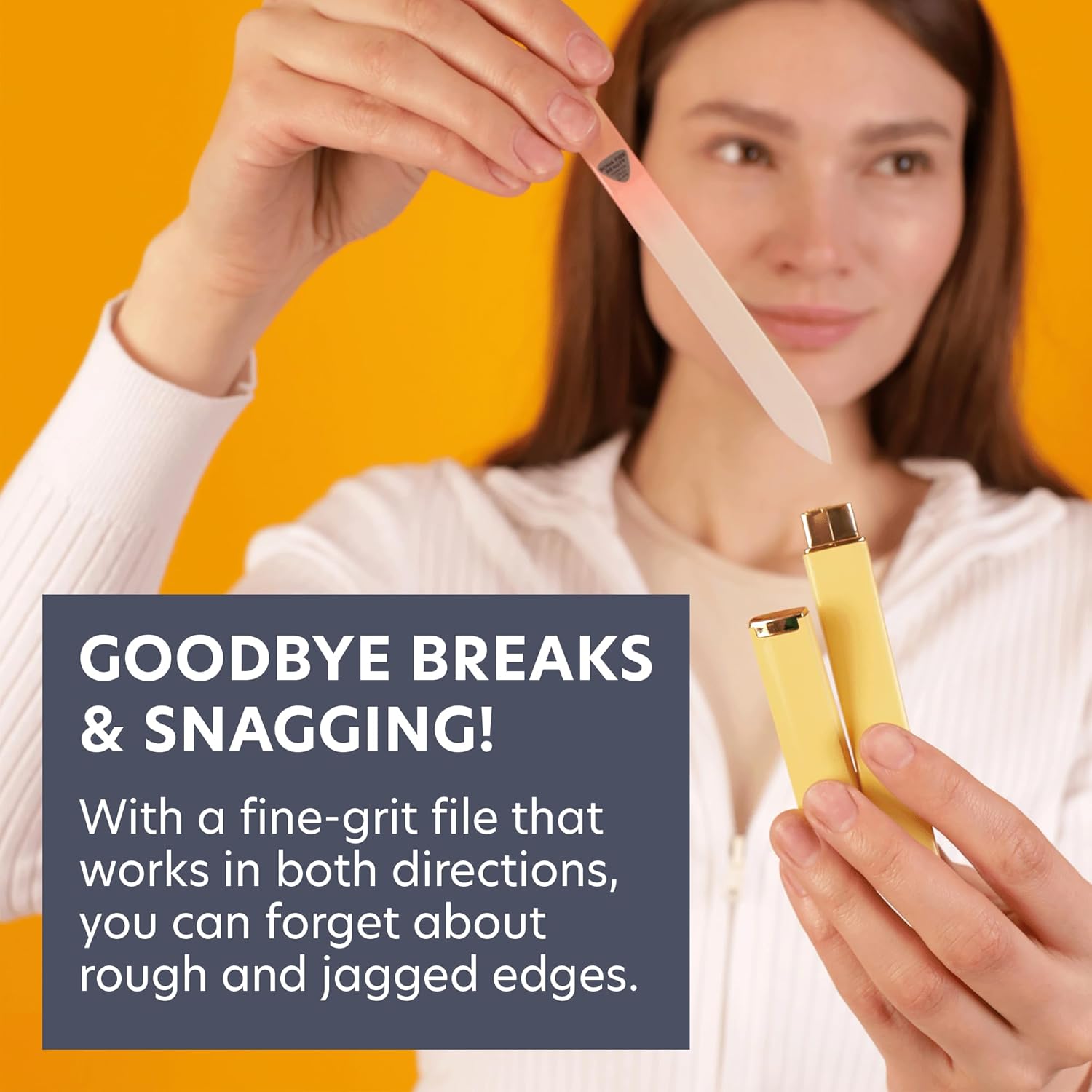 - Durable, Long-Lasting and Reusable Czech Glass Nail File: premium Czech ‘Bohemian’ glass, tempered (toughened) to ensure the glass is strong, wear-resistant & retains the integrity of the filing surface after multiple uses. The surface of an etched glass file lasts longer than non-etched nail files.