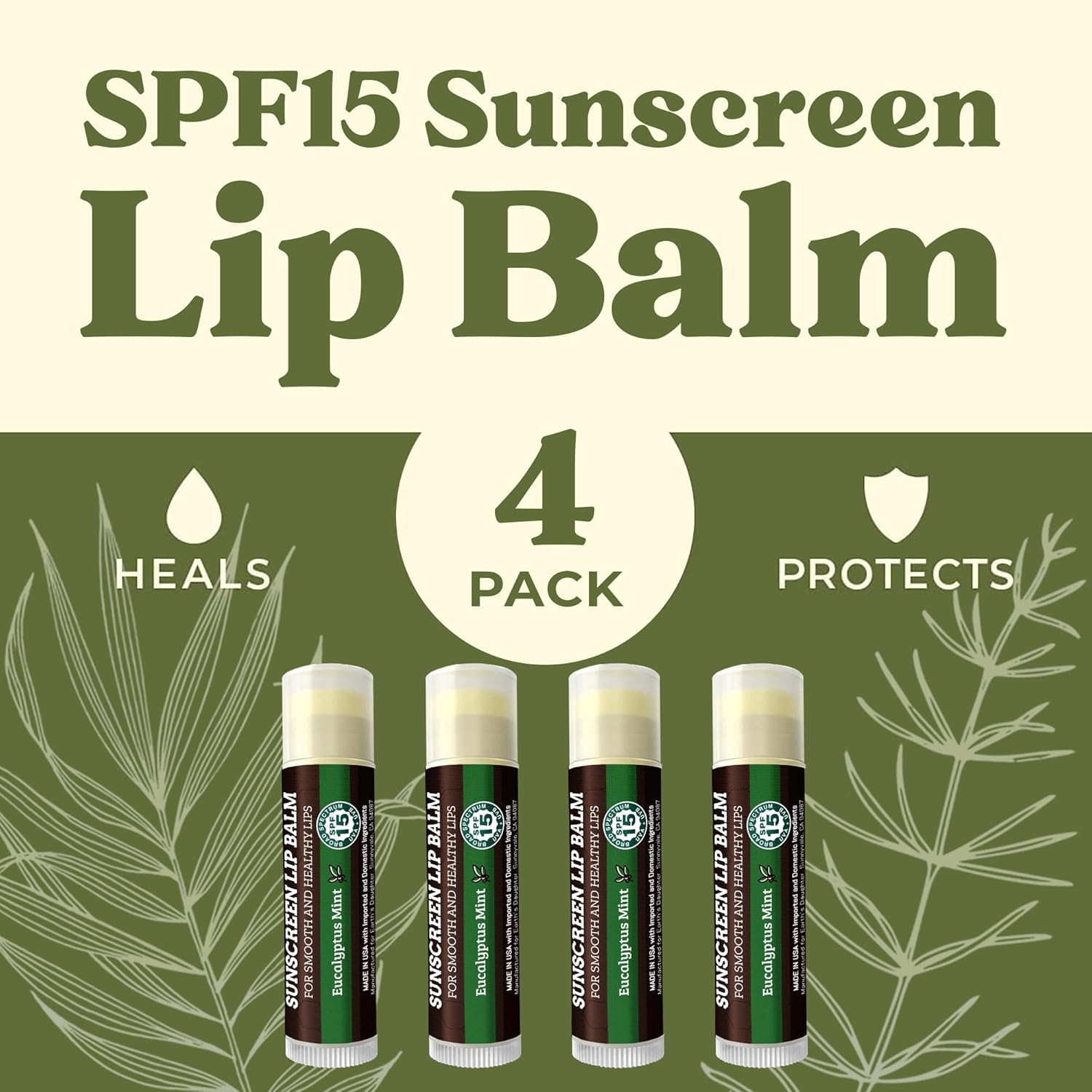 - 4 PACK of SPF 15 SUNSCREEN LIP BALM – Delicious Eucalyptus Mint. Everyone loves our mint lip balm with SPF 15 sun protection, organic beeswax, organic coconut oil and other premium organic hydrating ingredients to protect and moisturize all day long. Our lip balm is great for everyday protection and safe for the whole family