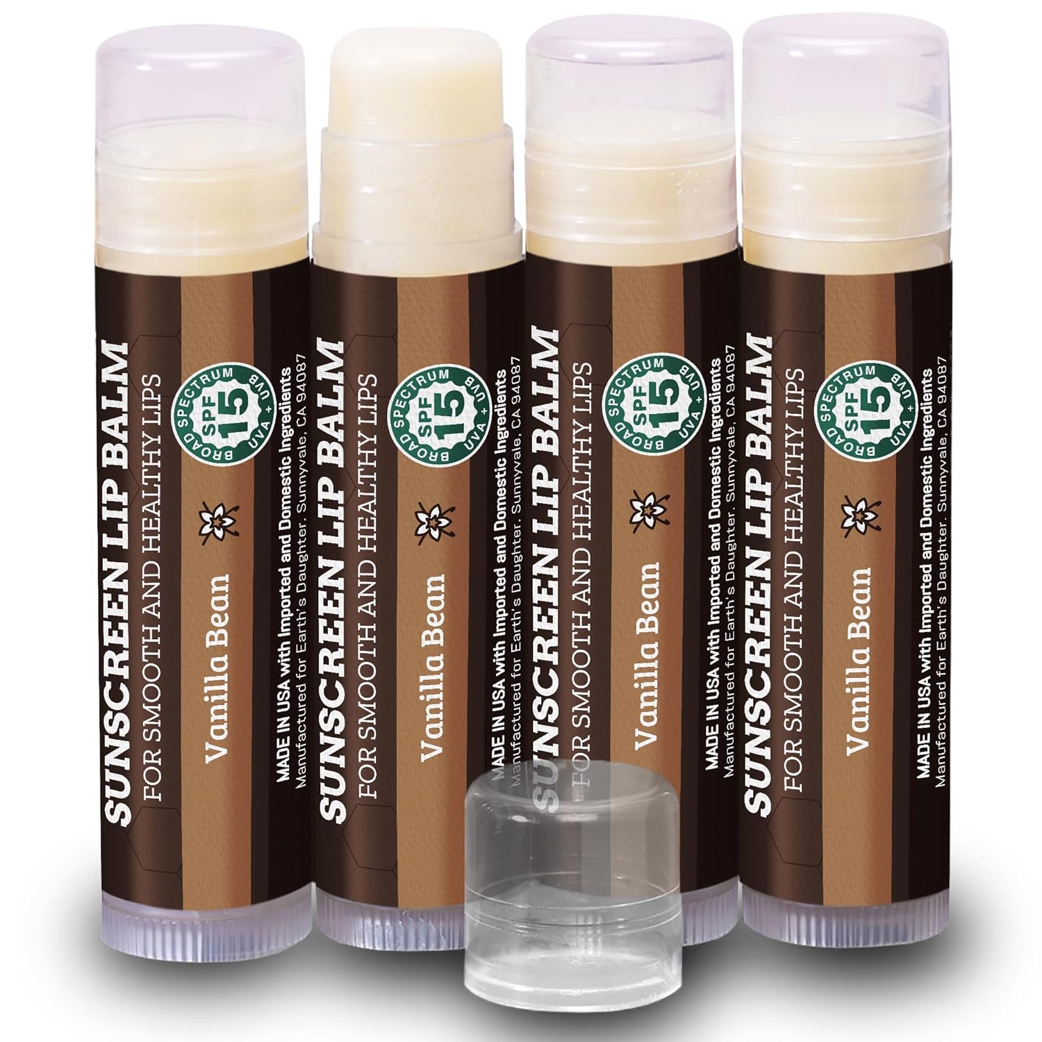 Earth's Daughter SPF Lip Balm 4-Pack - Lip Sunscreen, SPF 15, Organic Ingredients, Vanilla Flavor, Beeswax, Coconut Oil, Vitamin E - Hypoallergenic, Paraben Free, Gluten Free