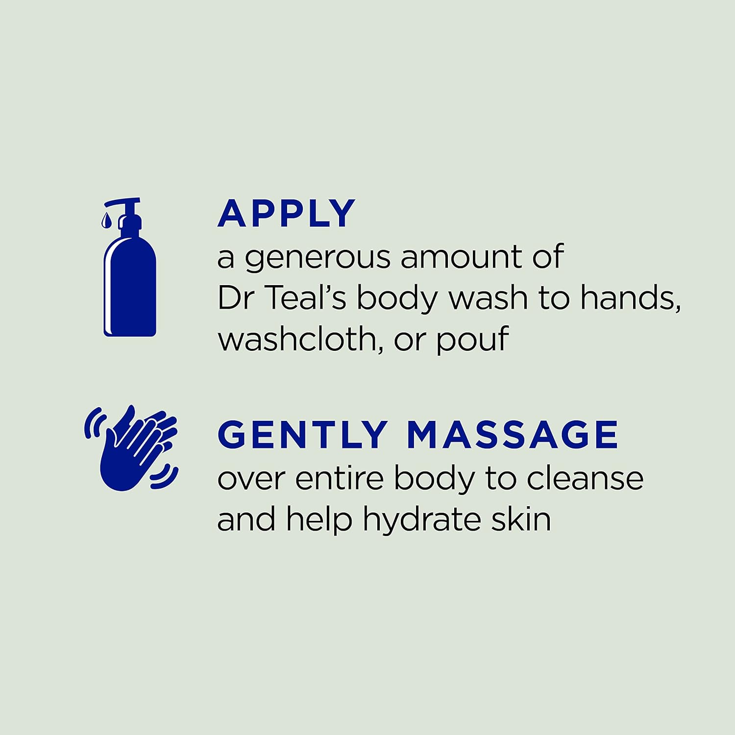 - Apply a generous amount of Dr Tealโs body wash to hands, washcloth, or pouf, then gently massage all your body for ultra-moisture and total rejuvenation.