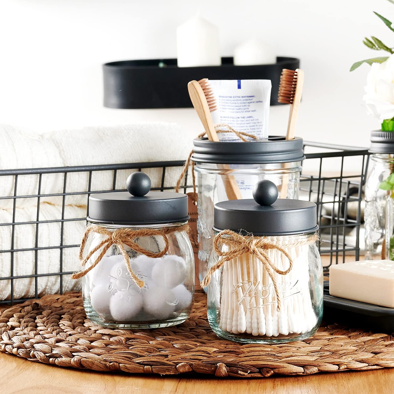 - ✔️Versatile Gift Idea: Ideal for a variety of occasions, this bathroom organizer and storage set is perfect for weddings, housewarming events, birthdays, Mother's Day, Thanksgiving Day, Christmas, New Year, bridal showers, and baby showers. It also makes an excellent gift for mothers, friends, sisters, co-workers, or anyone else, suitable for use throughout the year. The package includes: 2 pack glass mason jars with stainless steal lids. 2 Decorative Twines. 2 Cute Label Stickers.