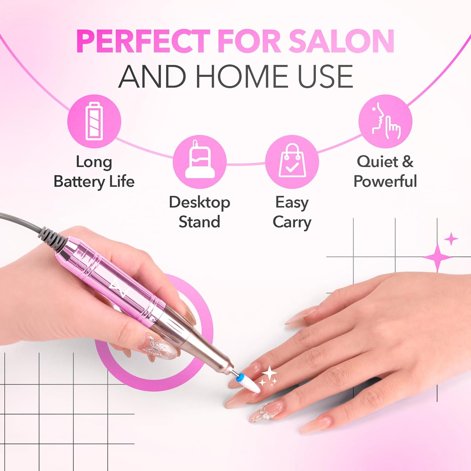 - 2-in-1 Design for Professional & Home Use: The portable e filer for nails machine features a 2-in-1 desktop and portable wireless design for easy operation at the salon or at home. New acetone-resistant aluminum alloy casing offers exceptional durability, protecting the machine from the corrosive effects of nail polish