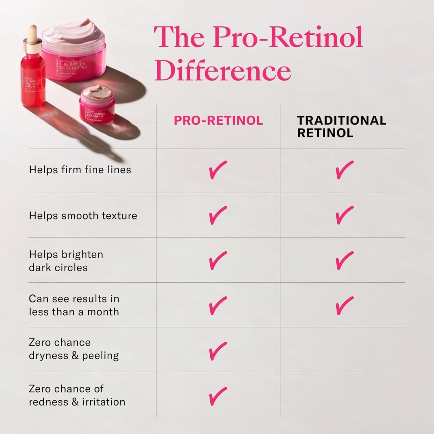 - Pro-Retinol Body Butter - This nourishing air whipped body butter is powered by Pro-Retinol derived from pink algae. This ingredient helps our anti aging cream visibly improve the look of fine lines and wrinkles while smoothing the body without causing flakiness or dryness.