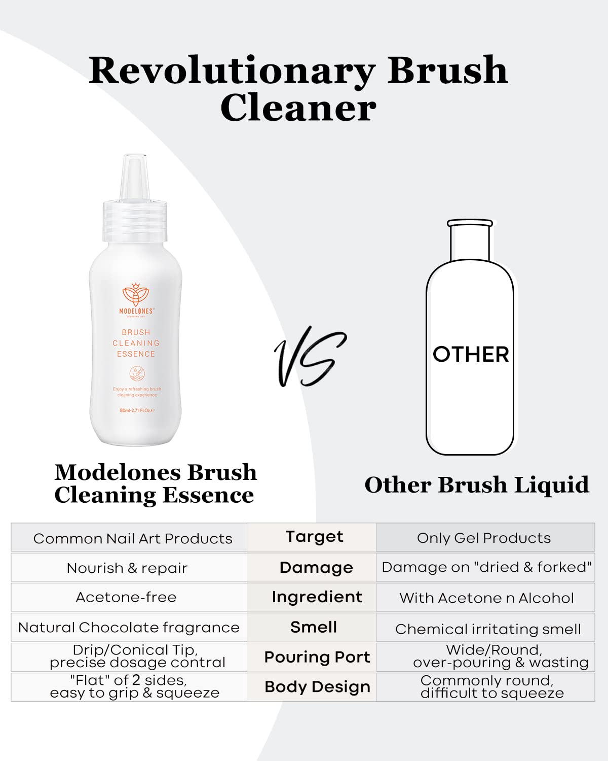 - 【Multi-Functional】 You can use Modelones brush cleaning solution in several ways: 1) Breaking in new brushes and removing sealing wax, 2) Moisturizing bristles to improve the application process and reduce brush streaks, and 3) Dissolving and cleaning residual color gel to change up your next color and prevent color mixing.
