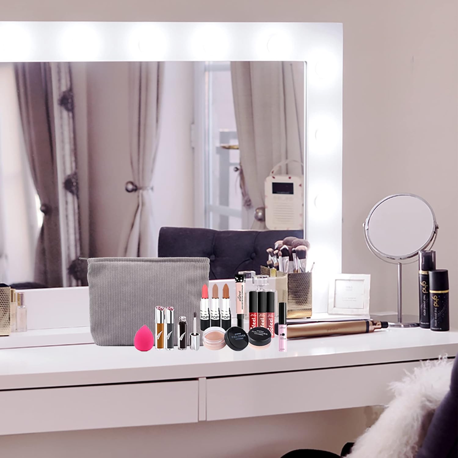 PAZIMIIK Makeup Bag Large Zipper Corduroy Make Up Pouch for Purse Travel Canvas Cosmetic Organizer for Women Brush Storage,Grey