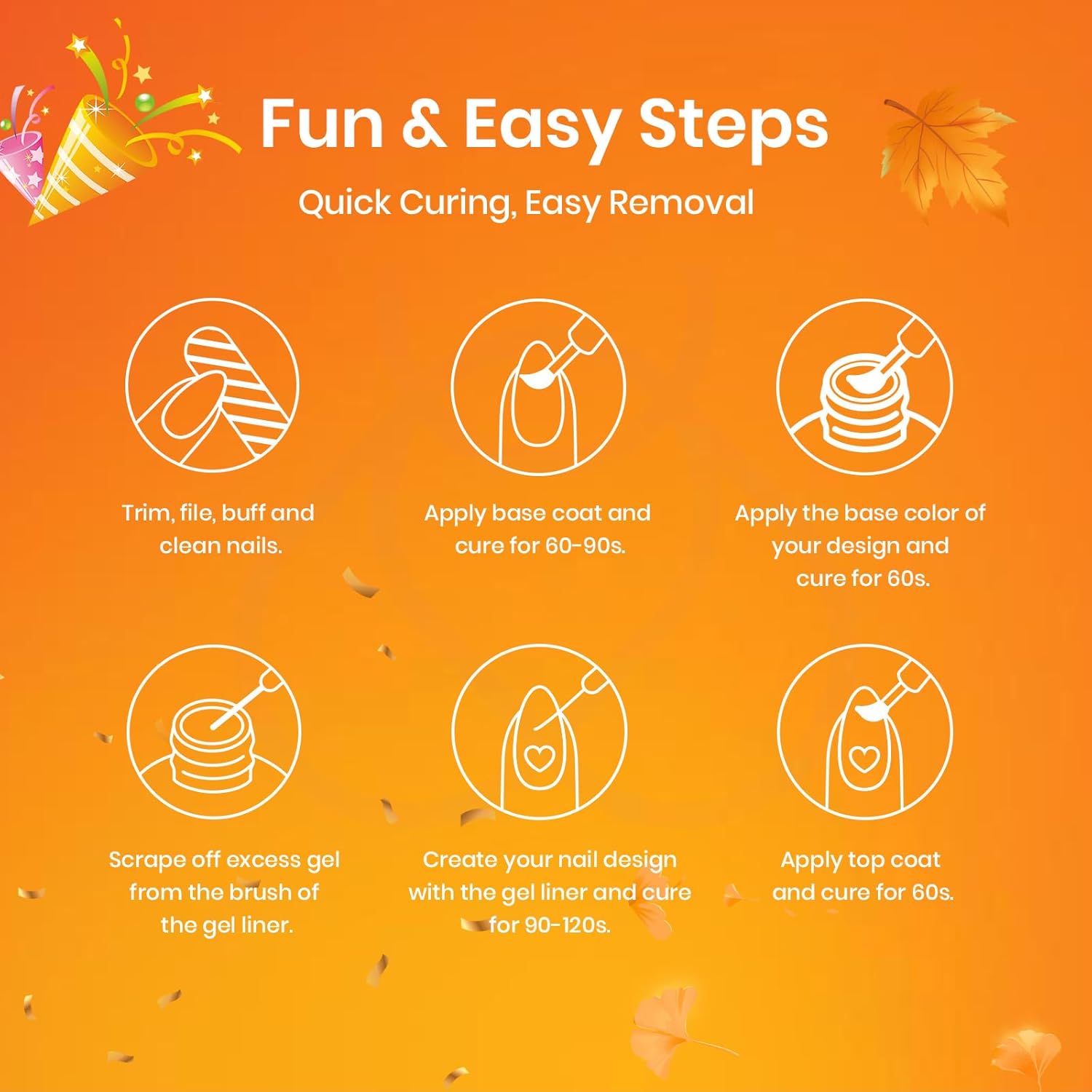 - Application: Just make sure you wipe your brush; otherwise, you’ll get a big drop. This is a french tip nail art liner gel polish. It must be cured using an LED UV Nail Lamp. Base and top coat are required. The average for an LED nail lamp is 60-120 secs.