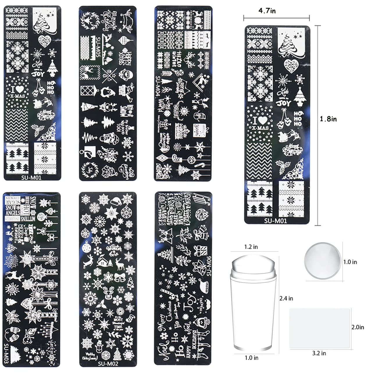 - [Package]:You will get Christmas nail art stamping set includes 6pcs nail stamping plates, 1 Stamper, 1 Lace scraper, and the size of each stamping plate is 4.72*1.57 inch.