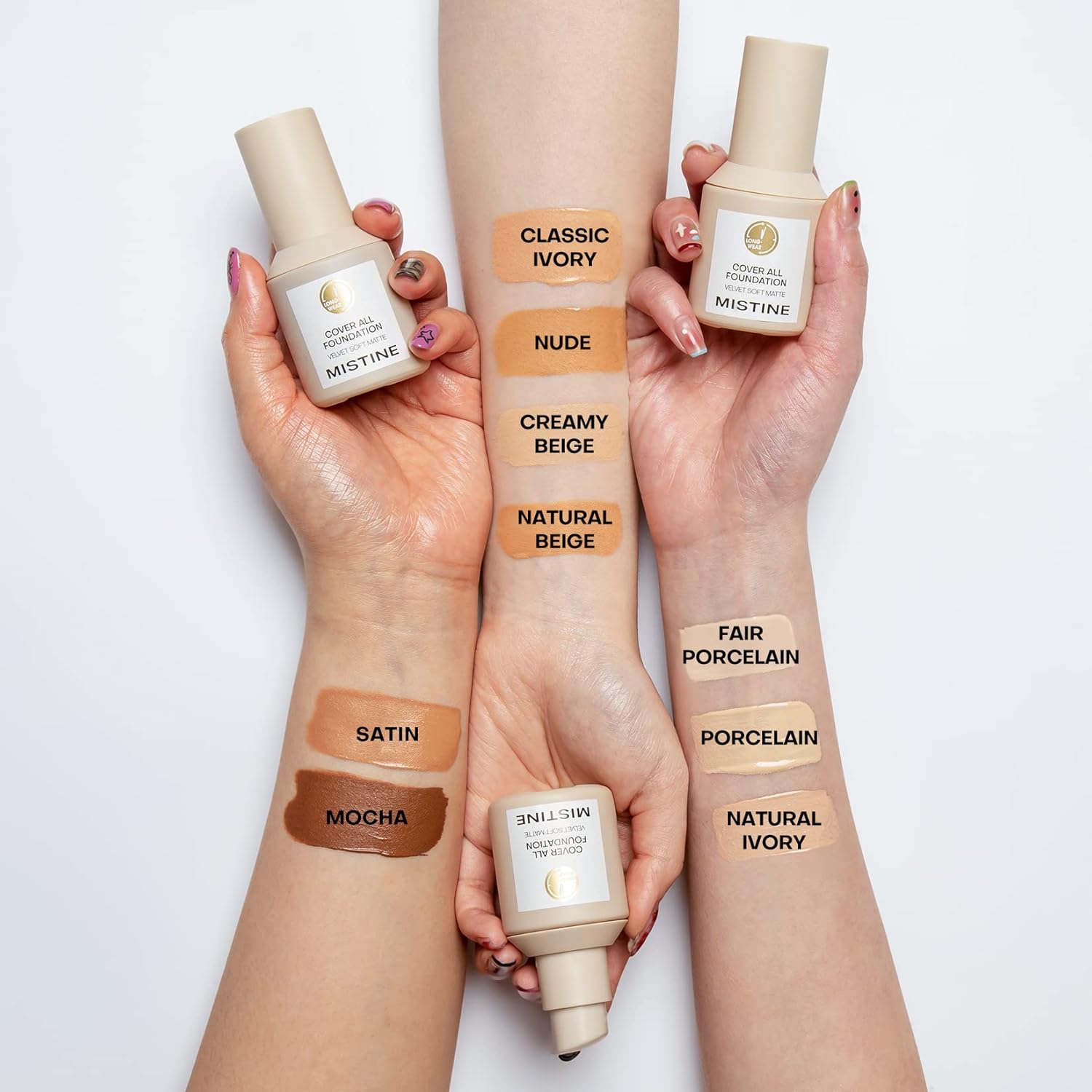 - [MISTINE COVER ALL AIRY MATTE FOUNDATION MAKEUP] It is a full coverage foundation makeup with a silky, weightless texture that delivers a high-perfection complexion with 24h wear and gives a natural matte makeup finish with no shine.Formulated with Natural plants extracts help provide antioxidant benefits and promote a fresh,smooth look.Available in 4 shades so you can find the right match for your skin tone.This foundation is suitable for normal to oily skin.