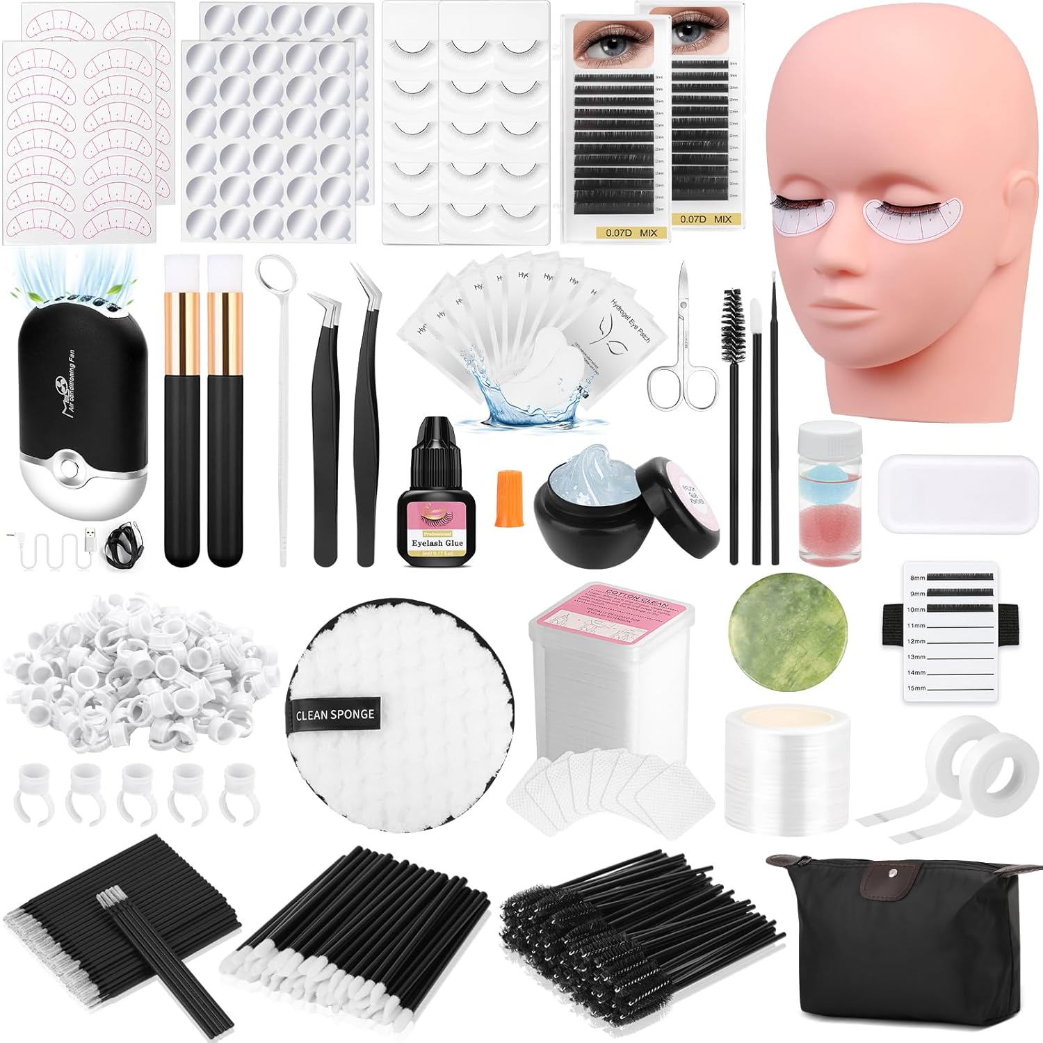 - Complete Eyelash Extension Practice Kit with Everything: Lash extension kit for beginners including lash mannequin head, USB fan, eyelash glue(shake before use) lash glue remover (For mannequin head only),0.07D mix eyelash, practice eyelash, eyelash tweezers, disposable eyelash plastic wrap, eyelash extension glue wipes, tweezer cleanser, glue sticker pads, storage bag, makeup remover pad, eyelash extension jade stone, eyelashes stand holder plate, eyelash brushes, micro swab