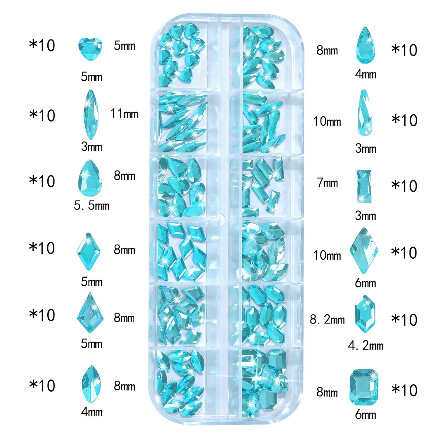 - ★Aquamarine nail rhinestones - contains 2 boxes nail rhinestones and gems,about 2800pcs lake blue Flat back nail rhinestones and 120pcs multi-shape crystal nail rhinestones, 1pcs tweezer, 1pcs rhinestone picking pen and 6 sizes round lake blue nail gems for nails