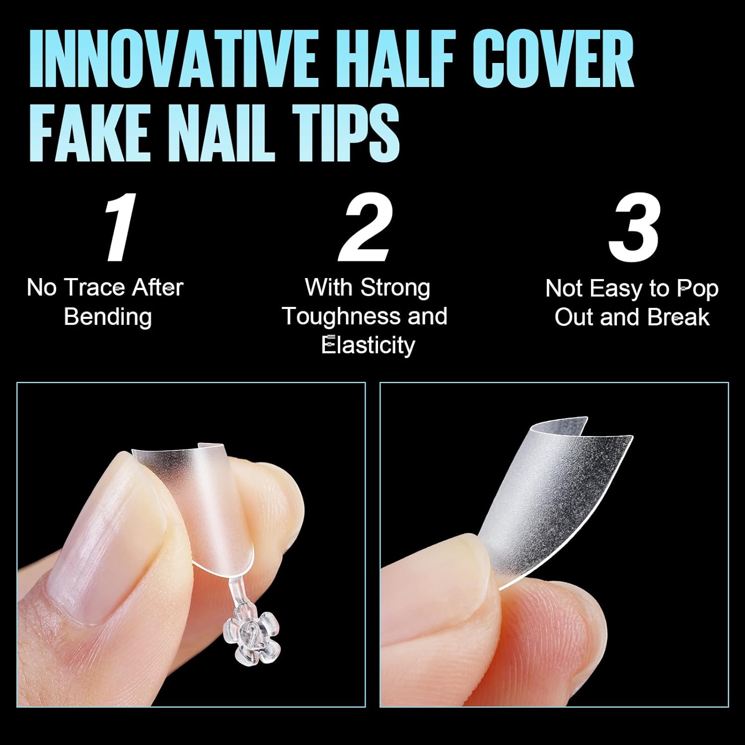 - 【Long Lasting 21 days+】According to the correct use method, it only takes a few minutes to extend your nails, and at the same time maintain the nail extension effect long lasting for 21+ days. No smell, no harm to nails. No crease acrylic half cover nail tips. Save time and money on trips to the nail salon, enjoy nail diy fun with your friends and family.