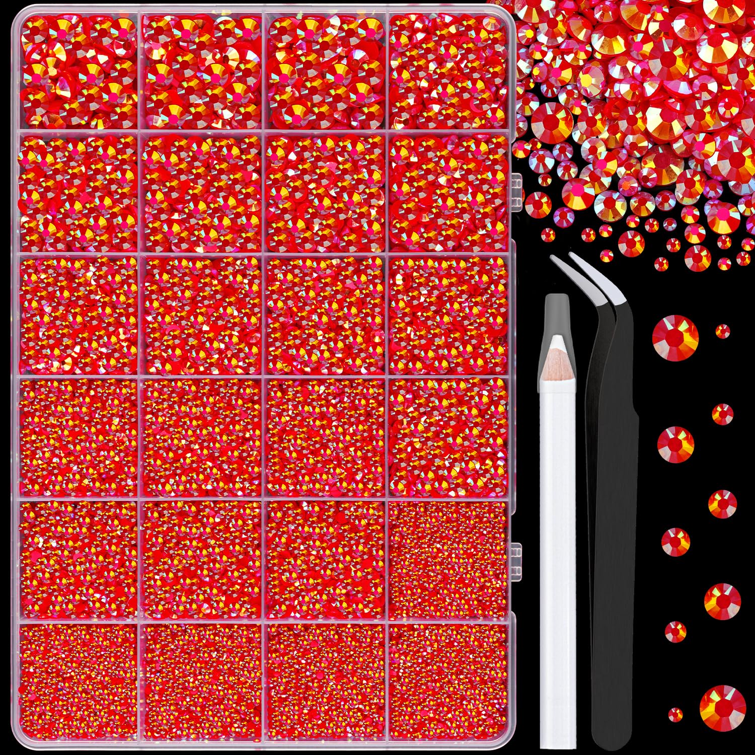 - 💎PACKAGE CONTENT -- The package includes 1 box with 24 grids, featuring a variety of sizes: 2mm x 5 grid, 3mm x 6 grid, 4mm x 5 grids, 5mm x 5 grids, and 6mm x 3 grids, approx. 25000 pcs of 2-6mm bling-out resin rhinestones (Red AB). 1 tweezers and 1 pickup pen are included for easily picking up of rhinestones. The large amount will support you to fulfill a number of your wonderful DIY decoration ideas.