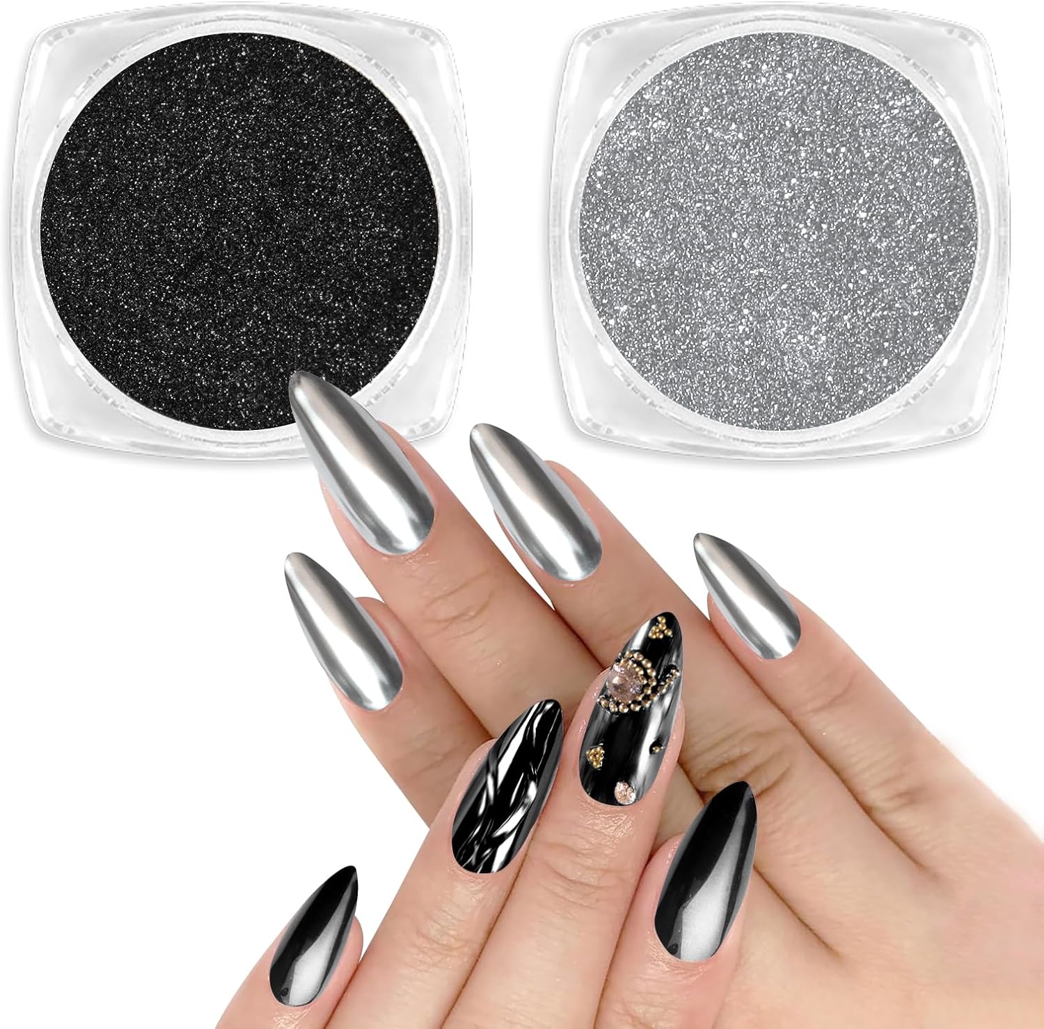 Allstarry Chrome Nail Powder 2pcs Black Silver Metallic Mirror Effect Dust Glitter Glazed Manicure Decoration Reflective Pigment for Gel Polish Nail Art Decoration- Milky Trajectory