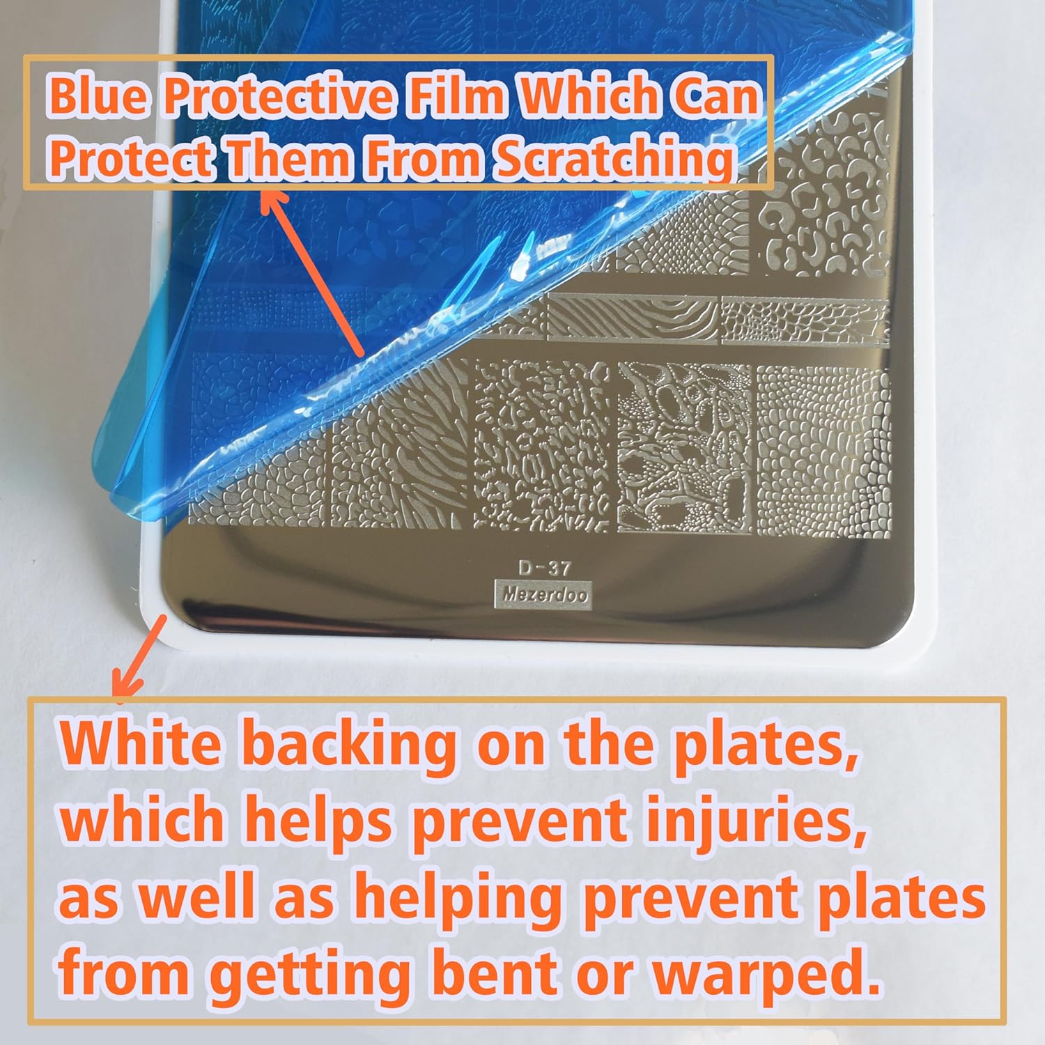 - EASY TO USE: This Nail Plates Stamping Set Easy To Stamp And Transfer, Each Plate Has Blue Protective Film Which Can Protect Them From Scratching, You Can Use The Stamping Gel Polish To Stamp And Get The Patterns.(Warm Tips: Nail Stamper Is Not Included)
