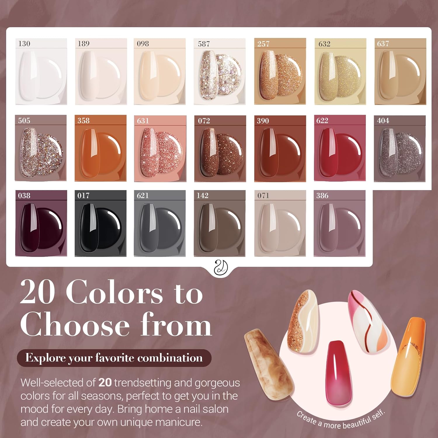 - Perfect Application: 20 popular and fashionable colors and more than 15,000+ shade combos can be designed, suitable for party or professional applications like wedding events, photo shoots, party nights out, and daily daytime Use. With flawless coverage these premium dip powders and your nails will look brilliant shiny finish, lightweight, and more attractive, you will look naturally beautiful