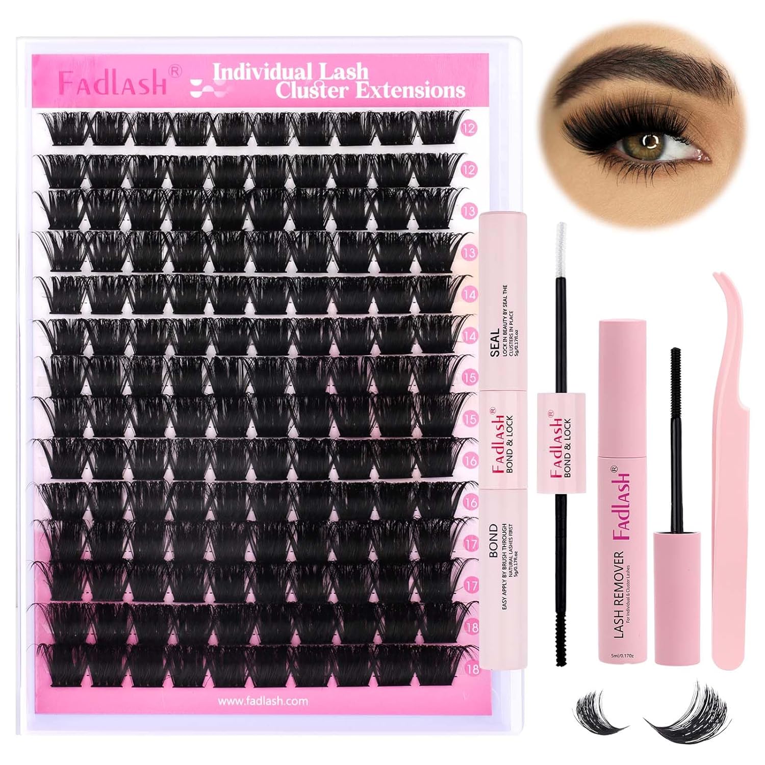 FADLASH Lash Extension DIY Kit Lash Clusters D Curl Cluster Lashes with Lash Bond and Seal Cluster Lashes Glue Remover Lash Tweezers for DIY Eyelash Extension at Home(Kit 200D-0.07D-12-18MIX), black