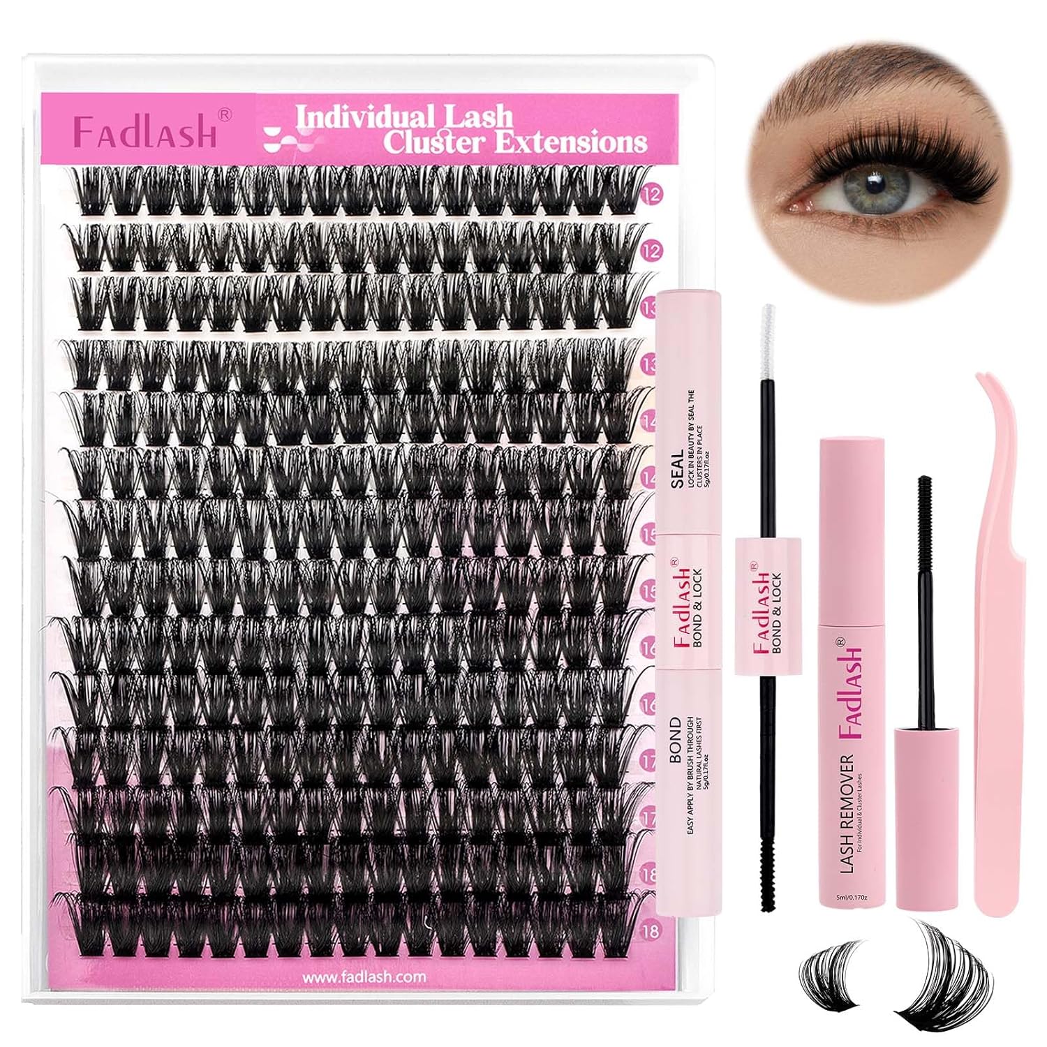 FADLASH Lash Extension DIY Kit Lash Clusters D Curl Cluster Lashes with Lash Bond and Seal Cluster Lashes Glue Remover Lash Tweezers for DIY Eyelash Extension at Home(Kit 80D-0.07D-12-18MIX)