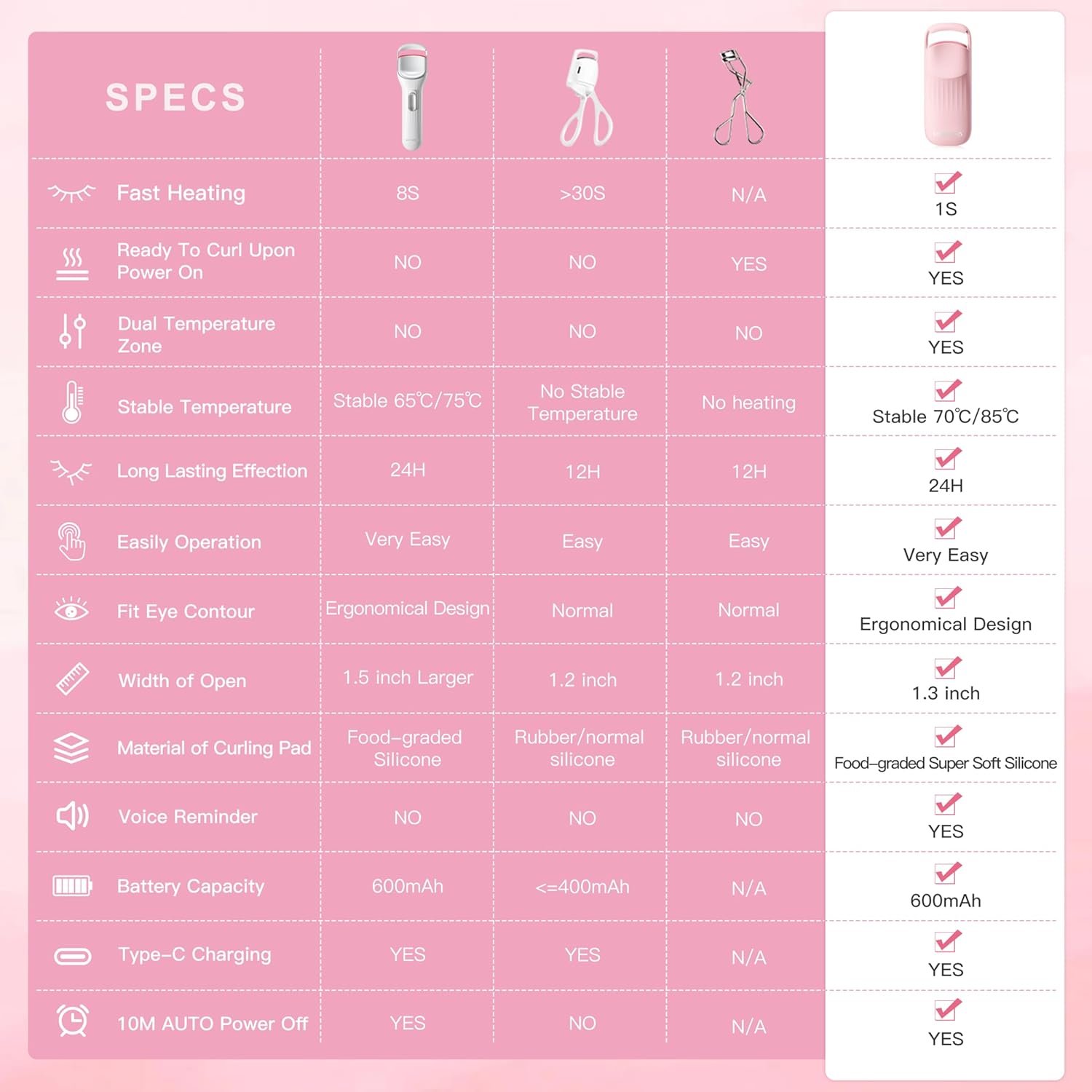 - Safe and Comfortable Use: we designed a Newest dual temperature zone silicone to avoid burning eyelids,the silicone near the eyelids is lower temperature; the silicone curling eyelashes is relatively high; the lash curler features a food-grade silicone high quality pad that is gentle on the lashes, avoiding break and providing a safe curling experience