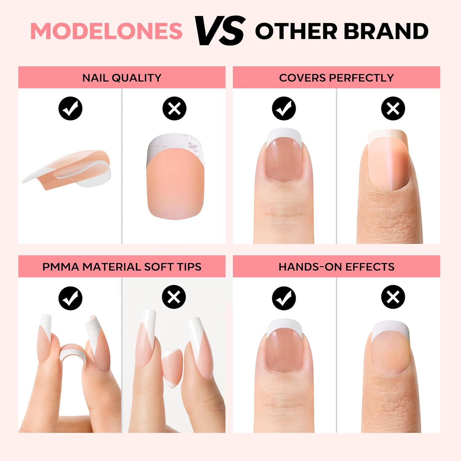 - PMMA Soft Material: These premium French nails tip feature flexible yet durable PMMA soft gel material with a pre-designed curvature that seamlessly blends with your natural nail shape for a flawless, salon-quality finish.