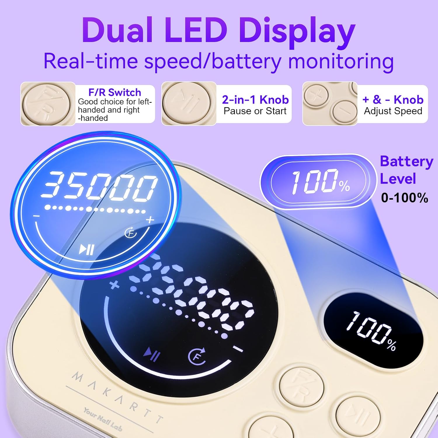 - Easy to Use Knob and Switch: The nail drill kit with knob offers ON/OFF/PAUSE,R/F rotation choice and variable speed control for different needs. Switch between Forward and Reverse rotation, suitable for both right-handers and left-handers. The LCD screen displays battery level, speed (RPM), F/R rotation and charging status