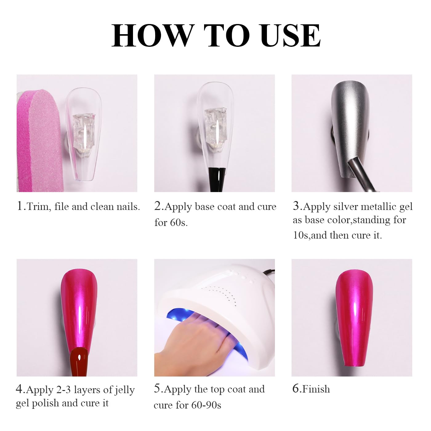 - Chrome Gel Nail Polish Kit:You'll get a bottle of metallic gel polish and a bottle of hot pink jelly gel nail polish.The shades are sheer, you can use it alone(no colored under coat) you get a sheer but spring summer color effect. If you apply with the metallic silver gel,you will get hot pink colors highly shine chrome manicure.