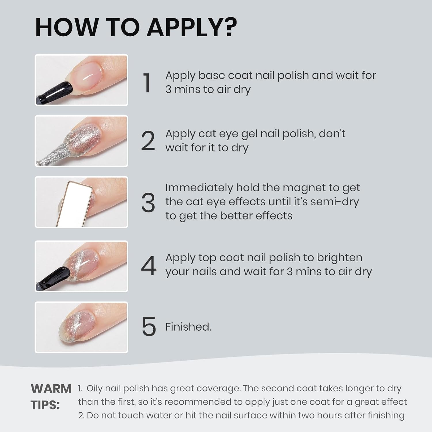 - Important Tips: 1. When the nail polish is not dry yet, it will be fluid. Use magnets to hold it in place until it's semi-dry, then take them off for a sharp cat-eye look 2. Do not touch water or hit the nail surface within two hours after finishing to avoid peeling; 3. Base and top coat nail polish art necessary