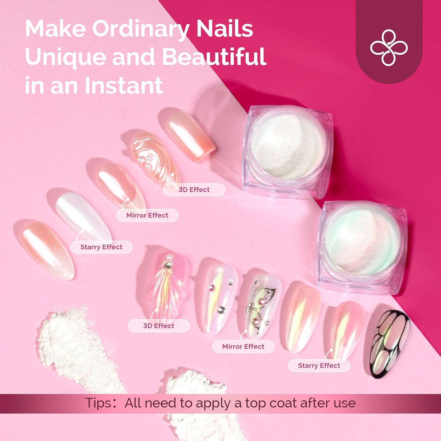 MelodySusie 2Pcs Chrome Nail Powder for Gel Nails, Pearl and Aurora Powder Mirror Effect Pigment Pearlescent Mermaid Pigment Pearl Glitter for Home DIY Salon Use