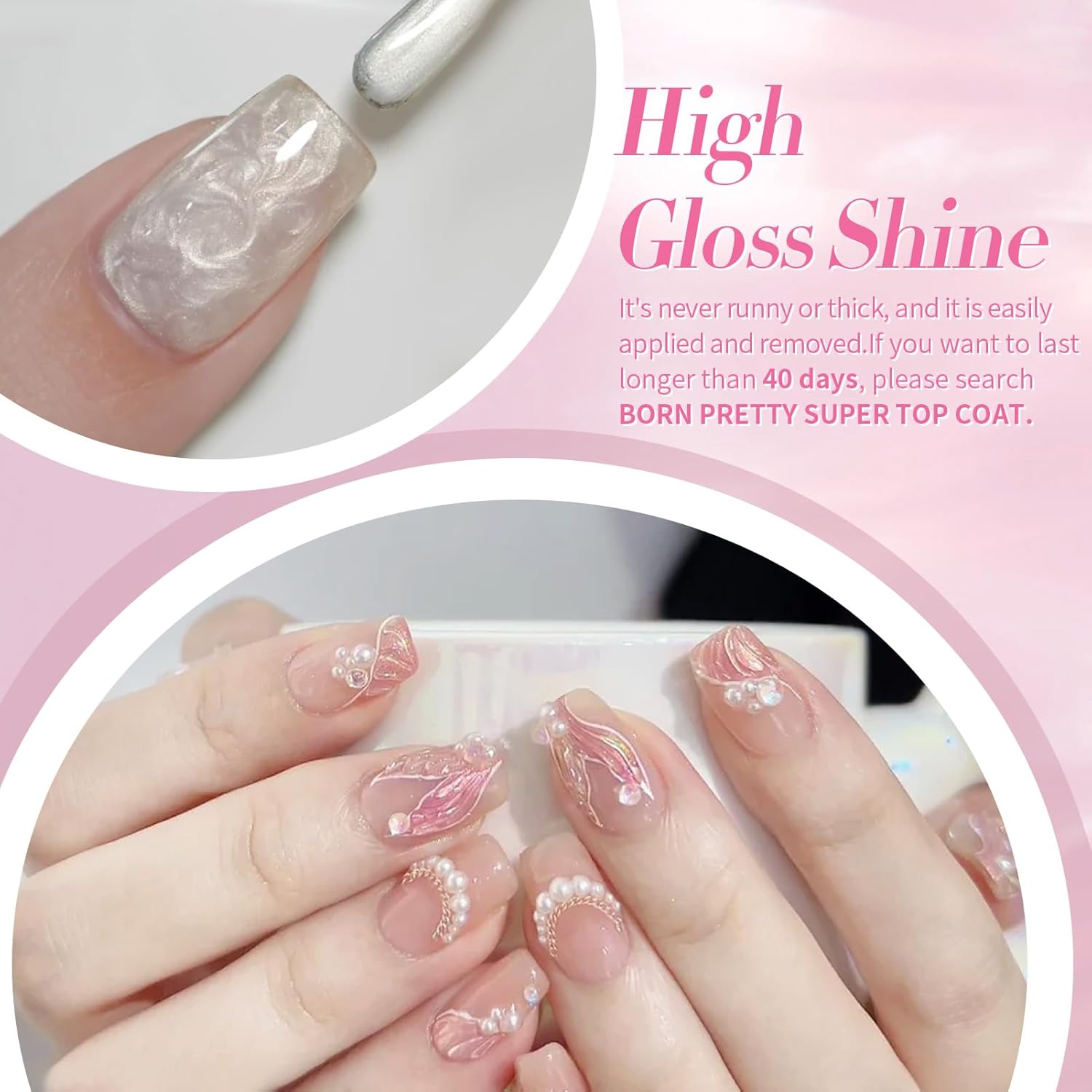 - PACKAGE CONTENTS: 6 Bottles BORN PRETTY 7ml Pearl Gel Nail Polish; Flawless coverage these glitter pearl gel nail polish and your nail would look brilliant shine finish and more attractive. Can get Swirl Shell Thread effect with the Dotting Pen