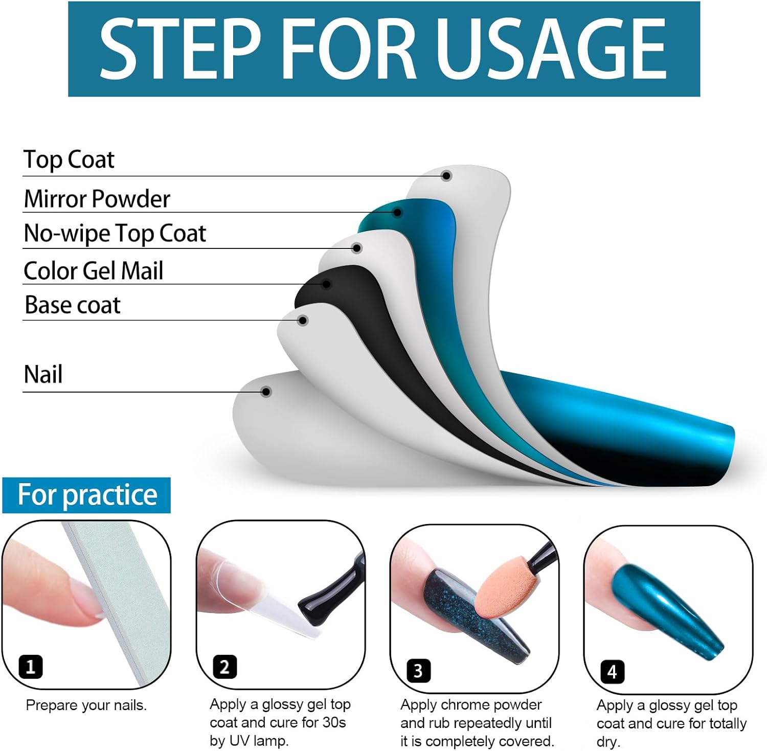 - The Scope Of Application:All chrome powders should only be applied to glossy No wipe top coat to embellish Nail-Polishes color. Otherwise it is unusable, it can't be applied directly to the nail, and it can't be applied directly to the skin. Artdone chrome powder can be applied on UV gel nails, acrylic nails or false nail tips. You can use them very easily