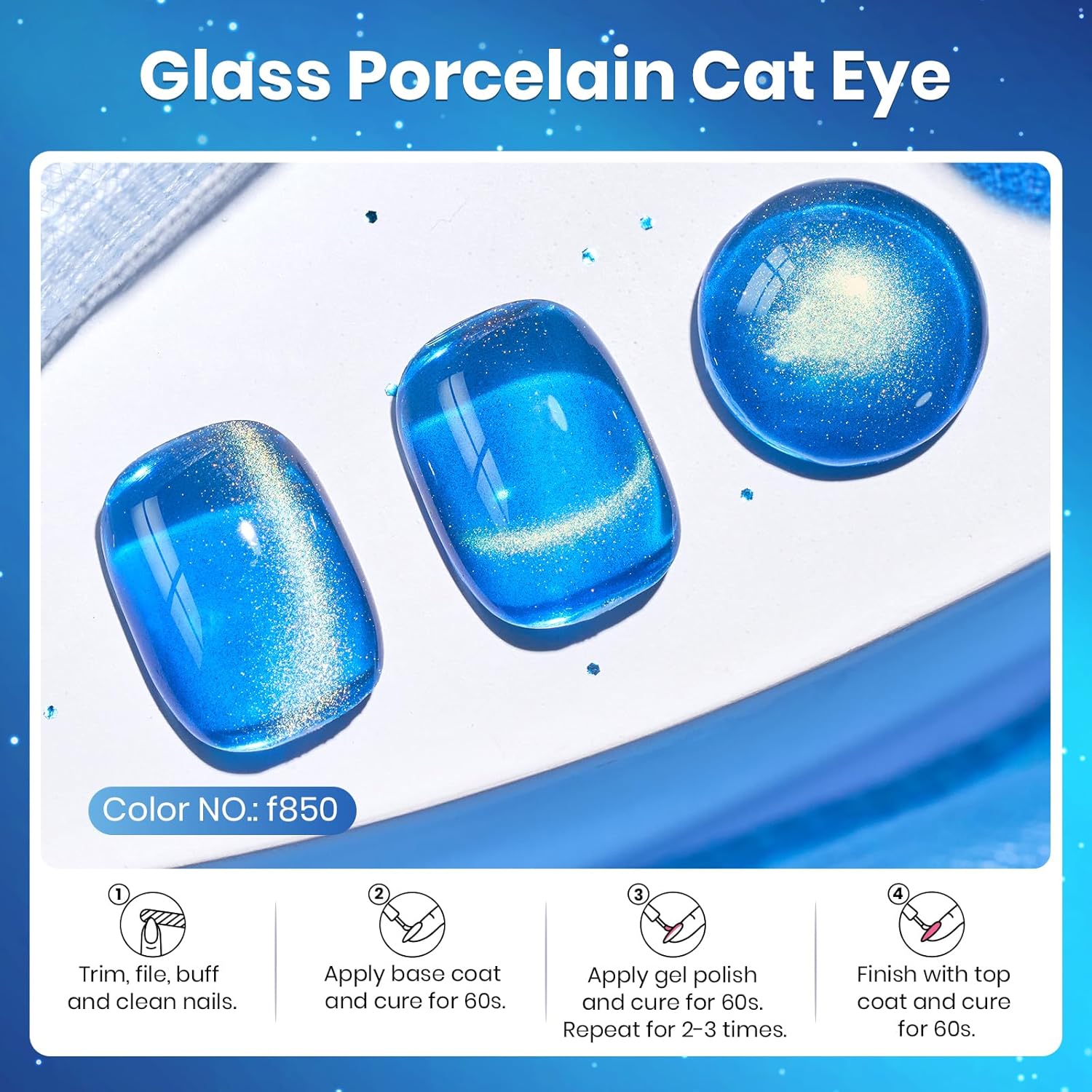 - 【Speed Curing with Uv/Led Lamp】The blue cat eye gel polish kit needs to be cured under the uv/led light. The average time for uv/led lights is 60-120 secs. It remains sticky after curing and must be used with a base coat and top coat! (Note:This item does not include a base&top coat, which needs to be purchased separately)