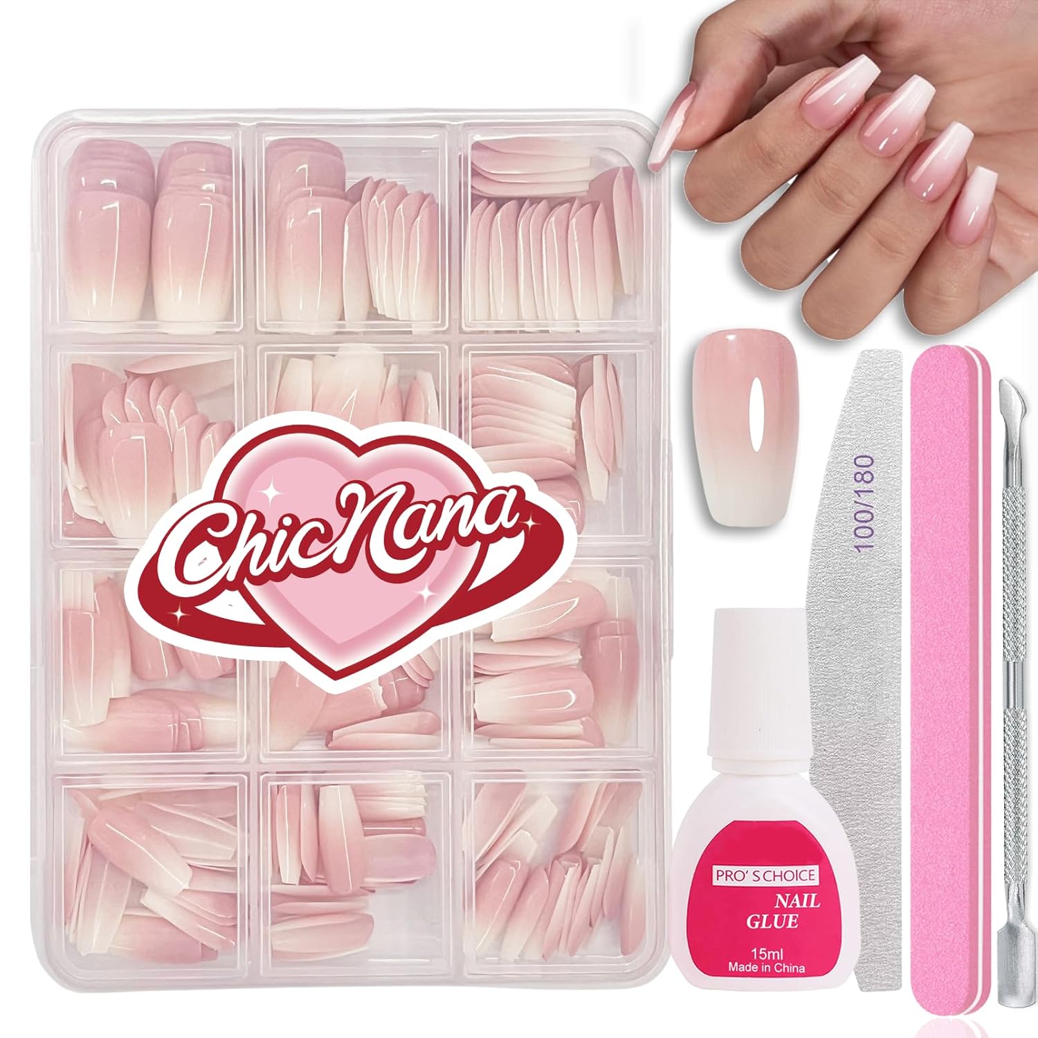 - 【Perfect Salon Stick On Nail Set】This ChicNana Ombre False Nails Kit includes 240pcs French style square press on nails glossy, all necessary tools as files*2, stainless steels cuticle pusher*1, 15ml nail glue*1 and the box with press on nails. Ombre false nail is a basic style in nail art and is a must have set for every girl who loves nail art