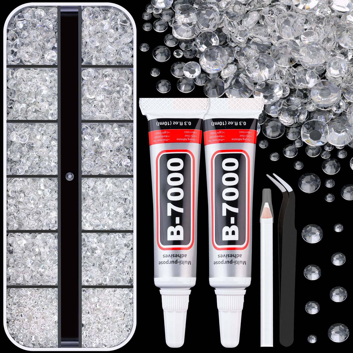 - WHAT YOU WILL GET -- The package includes 1 box of flatback rhinestones with 12 grids in diffrent sizes:2mm x 2 grids, 3mm x 4 grids, 4mm x 4 grids, 5mm x 2 grids. 1 tweezers for large size gems, 1 pickup pen for small size gems. 2 B7000 adhesive jewels glue for jewelry making.This rhinestone kit makes it easy for you to make any craft you like, and will bedazzle your artworks!