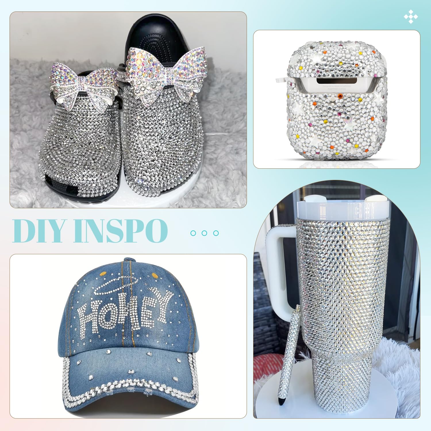 - WIDE APPLICATION -- These sparkling iridescent resin crystals are perfect for creating dazzling looks. Use them for bedazzling DIY crafts like shoes, tumblers, mugs, bottles, phone cases, popsockets, scrapbooks, photo frames, diamond paintings, greeting cards, bags, glasses, guitars, keychains, hats, masks, hair clips, bracelets, wristbands, clothing, wedding dresses, and more. Apply it to what you want to bling!