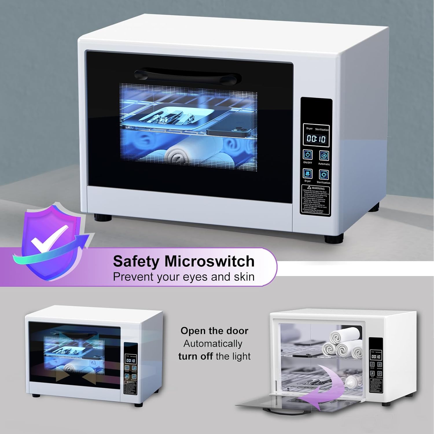 - Powerful & Hot Air Cleaning: This cleaning cabinet uses light and hot air to remove harmful substances and purify the air. light penetrates deep into tools, the stainless steel interior effectively accomplishes 360Β° cleaning of items, while hot air dries them quickly. The result? Clean, dry tools ready for use, providing a reliable hygiene solution for every professional