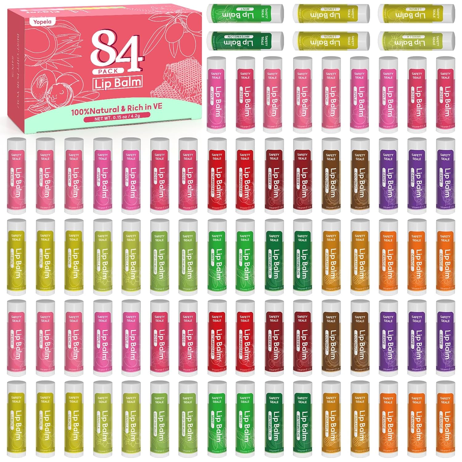 Yopela 84 Pack Lip Balm Bulk Variety Set,14 Flavors Hydrating & Natural Lip Balms, Moisturizing Dry Cracked Lips, Chap Stick Gift Set for Women, Men, Kids