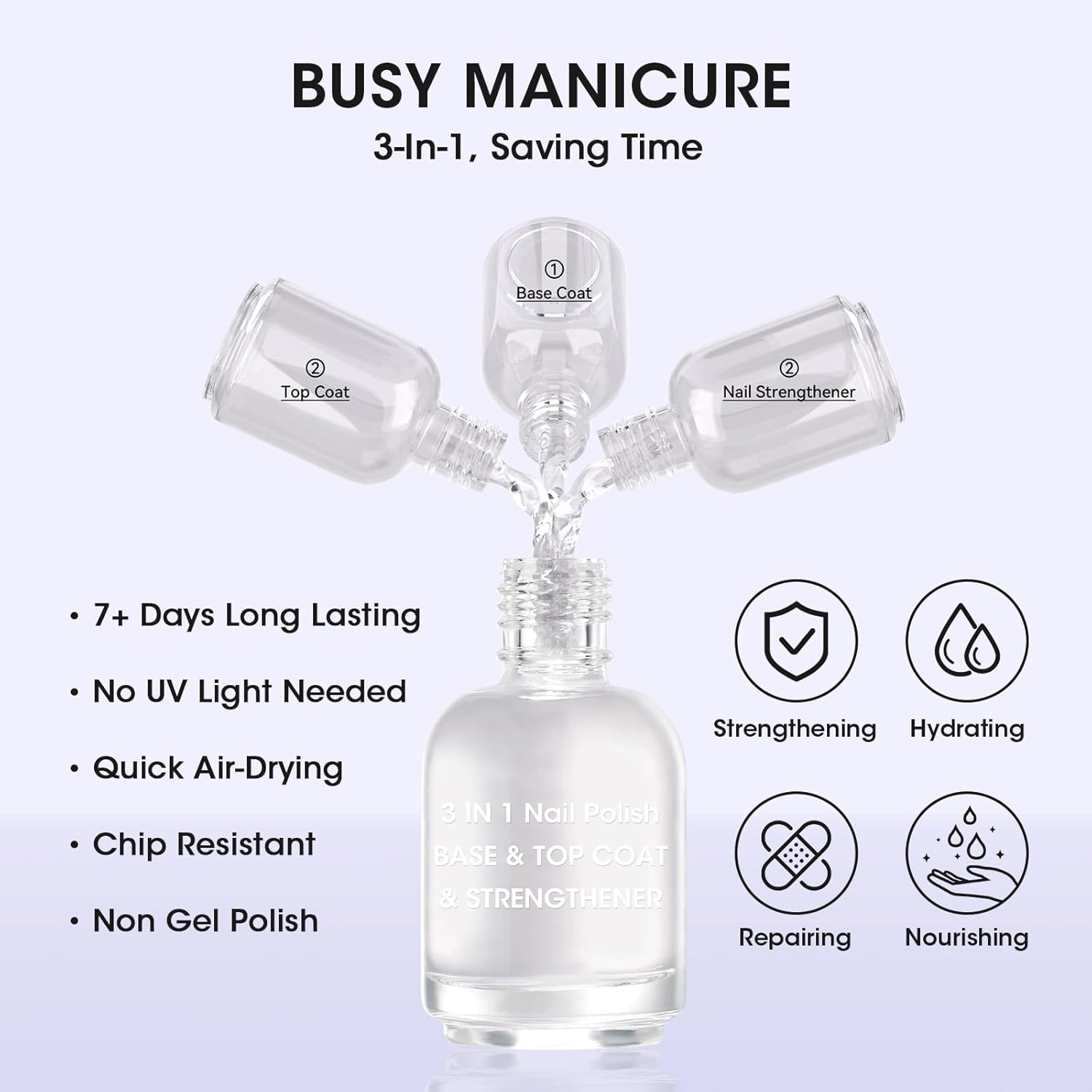 - 3-in-1 Formula: Base coat + top coat + nail strengthener in one bottle - saves time and money. Quick Air-Dry β dries fast