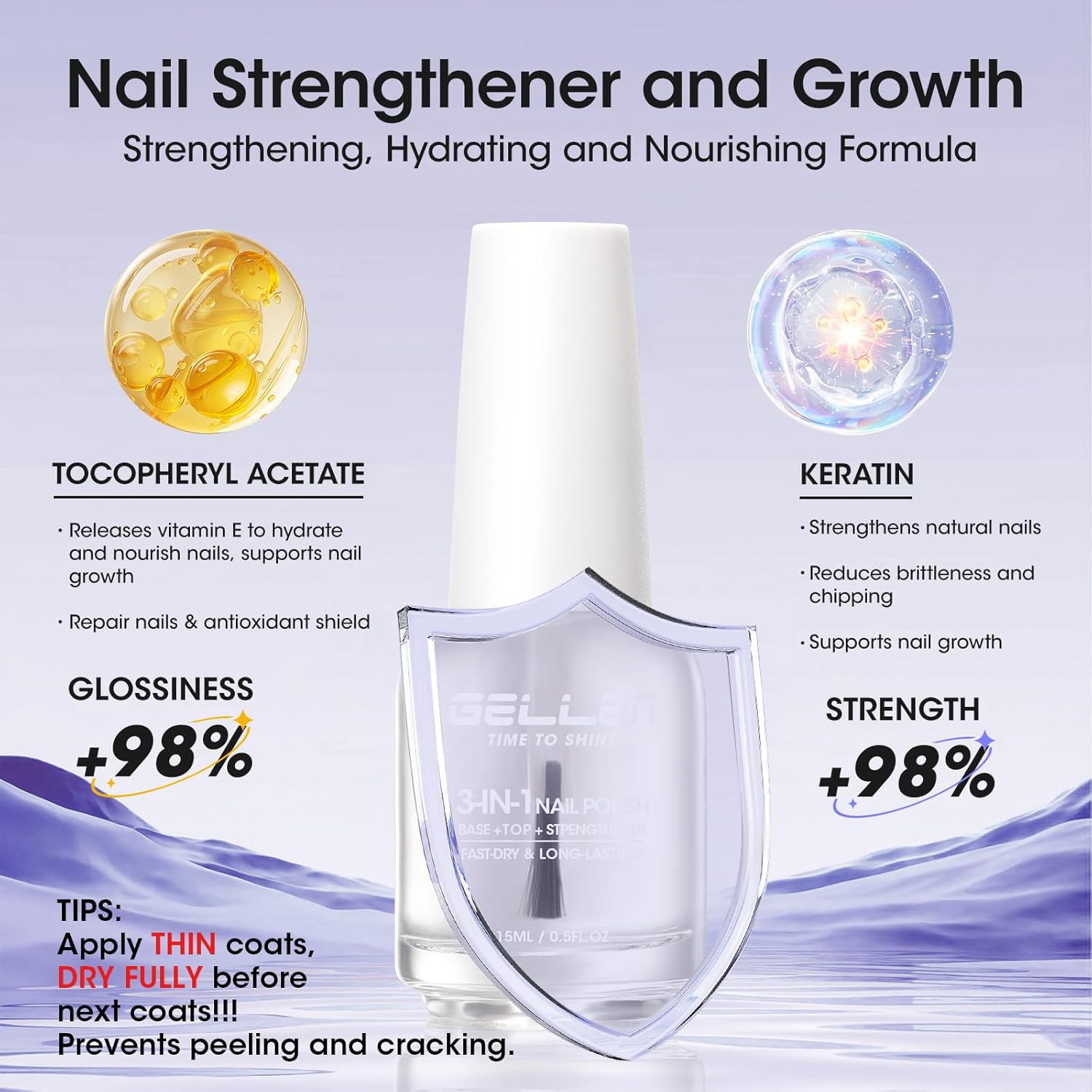 GELLEN 3-In-1 Clear Nail Polish Base Top Coat, Nail Strengthener and Growth, Hydrate Strengthen Nourish Damaged Dry Nails, Keratin & Vitamin E Formula, Air Dry, Hema Free, Non-toxic, Anti-yellowing