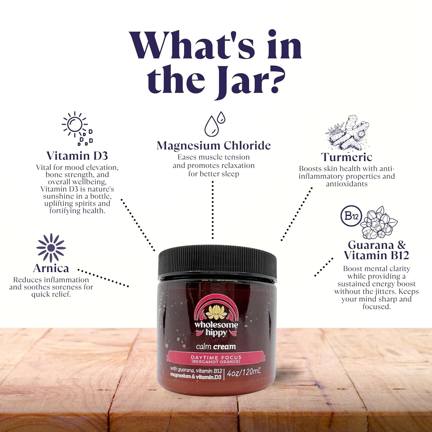 - Wholesome Hippy Daytime Focus Calm Cream – Energizing Body Butter with Magnesium, Vitamin B12, Guarana & Bergamot Orange – Moisturizing Wellness Cream for Daily Clarity – 4oz
