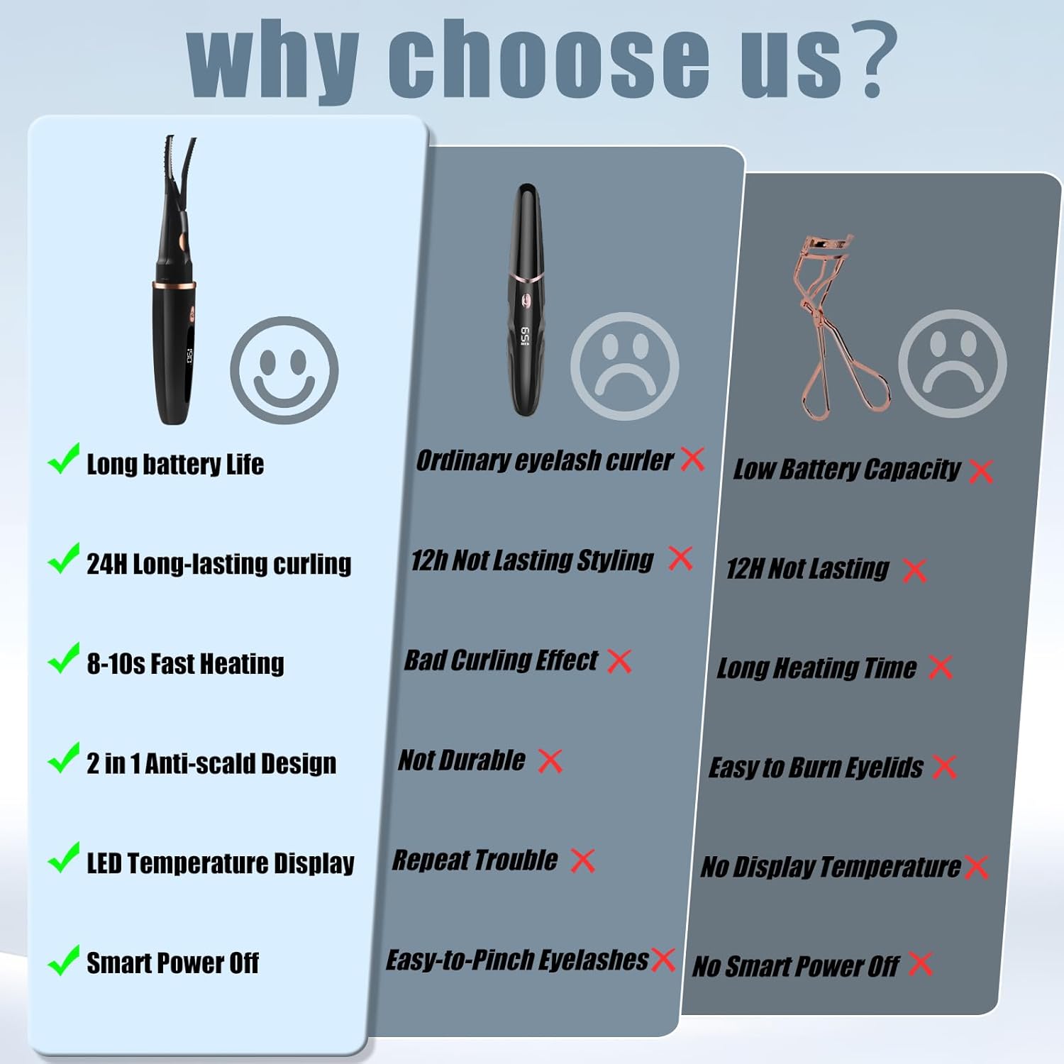 - Adjust Temperature Mode - Our heated eye lash curler comes with 3 temperature settings from 150°F to 190°F to gently curl your lashes and create stunning curls for amazing curling effect for different types of eyelashes, will not frizzing or pinching them