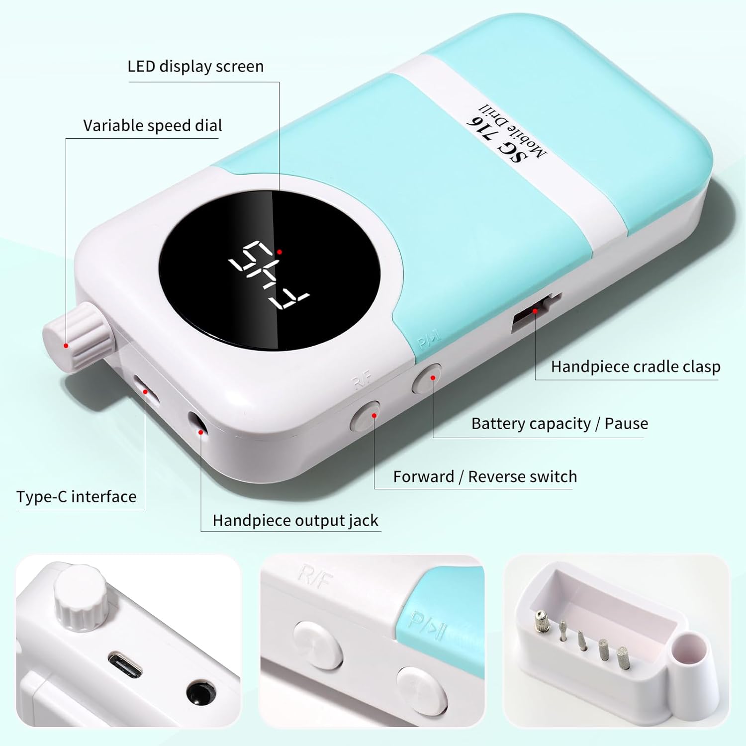 Electric Nail Drill Professional Kit - 45000RPM Electric Nail File Efile Portable Nail Drill Cordless with Bits & Base,E File Machine Nail Grinder for Women (Blue)