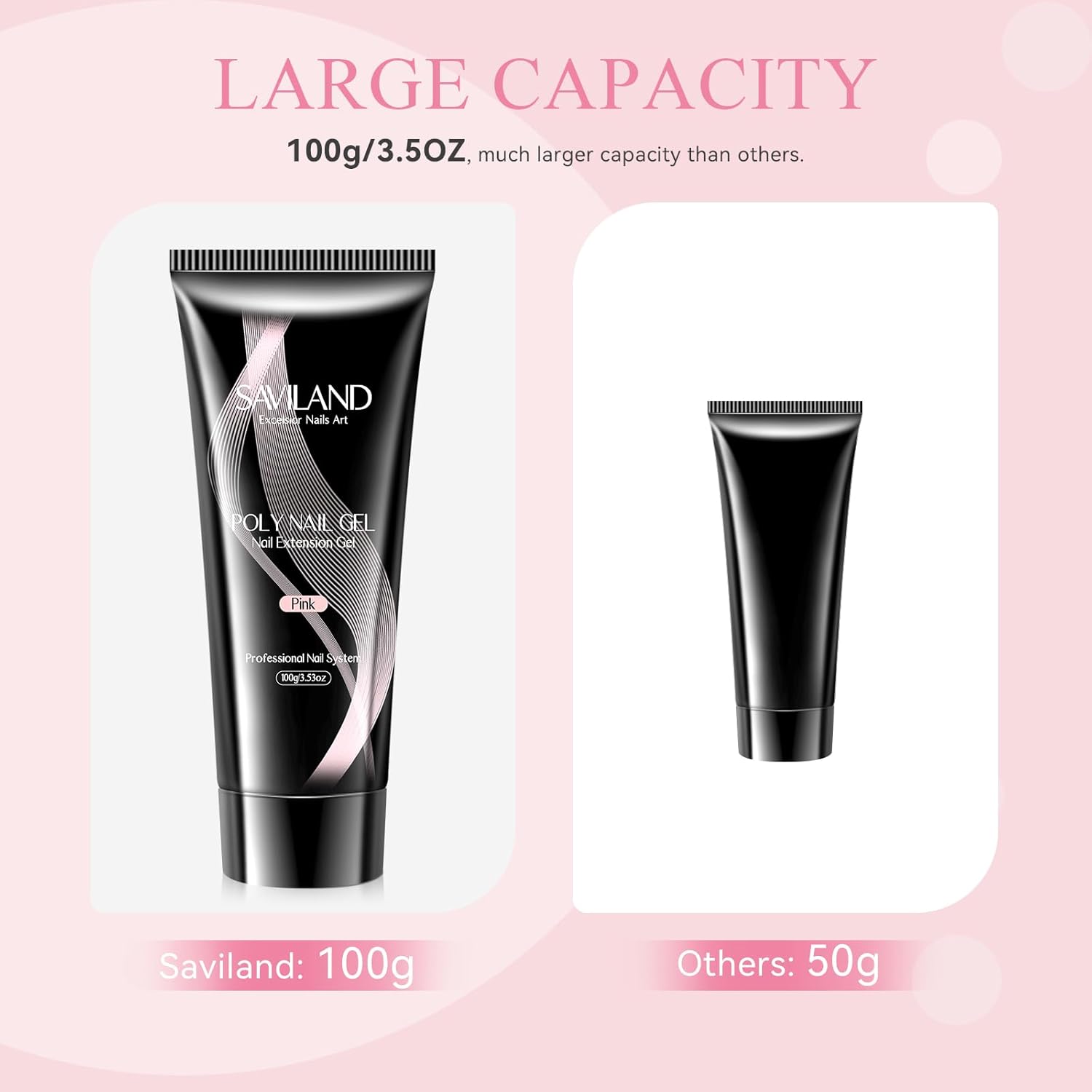 - π· SAVILAND BIG POLY NAIL GEL-Saviland 100g/3.5oz pink poly extension gel with popular classic color, can do nail extension, poly gel nails, nail enhancement, nail art, stick sequins or decorations, etc. 100g super large capacity, valuable, and long service life. It is very suitable for professional nail salons and nail lovers who often make extension. Can mix with other colorful gel to create various and attractive nail art.