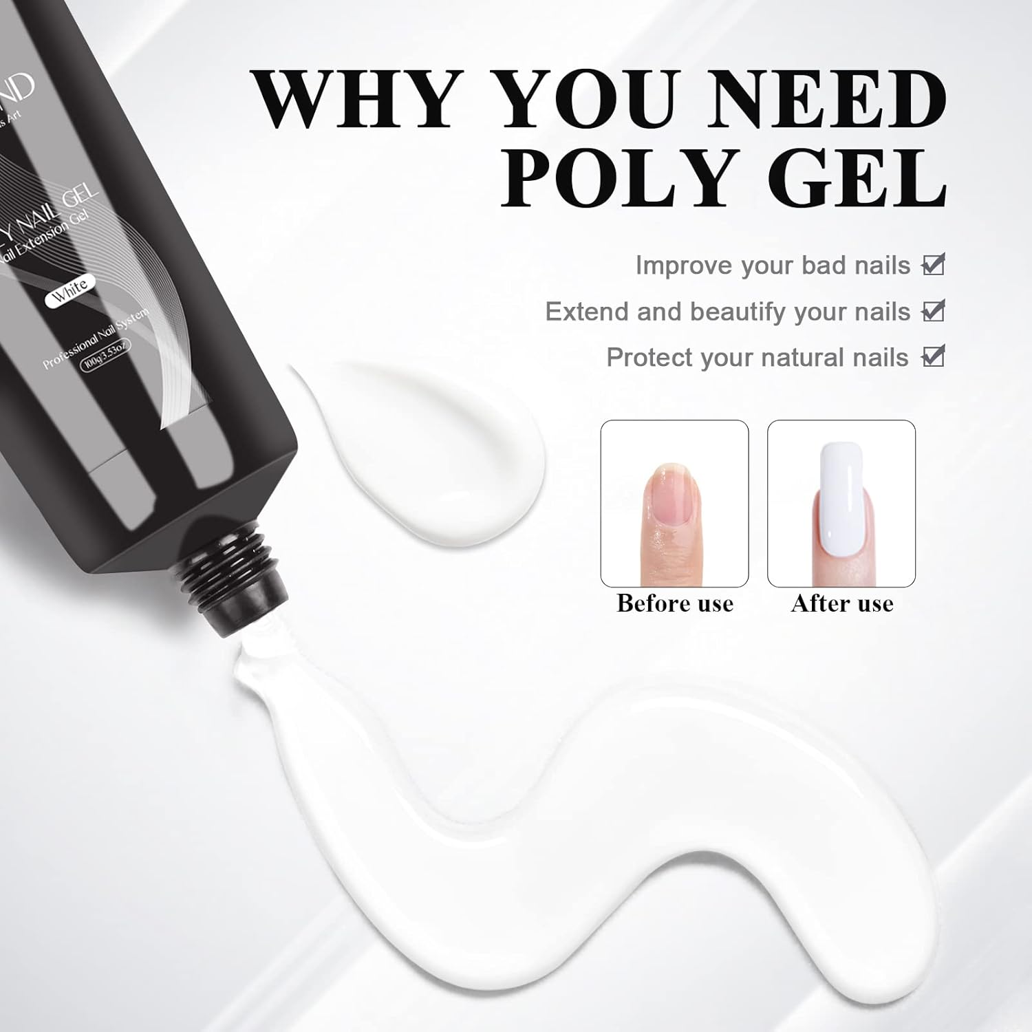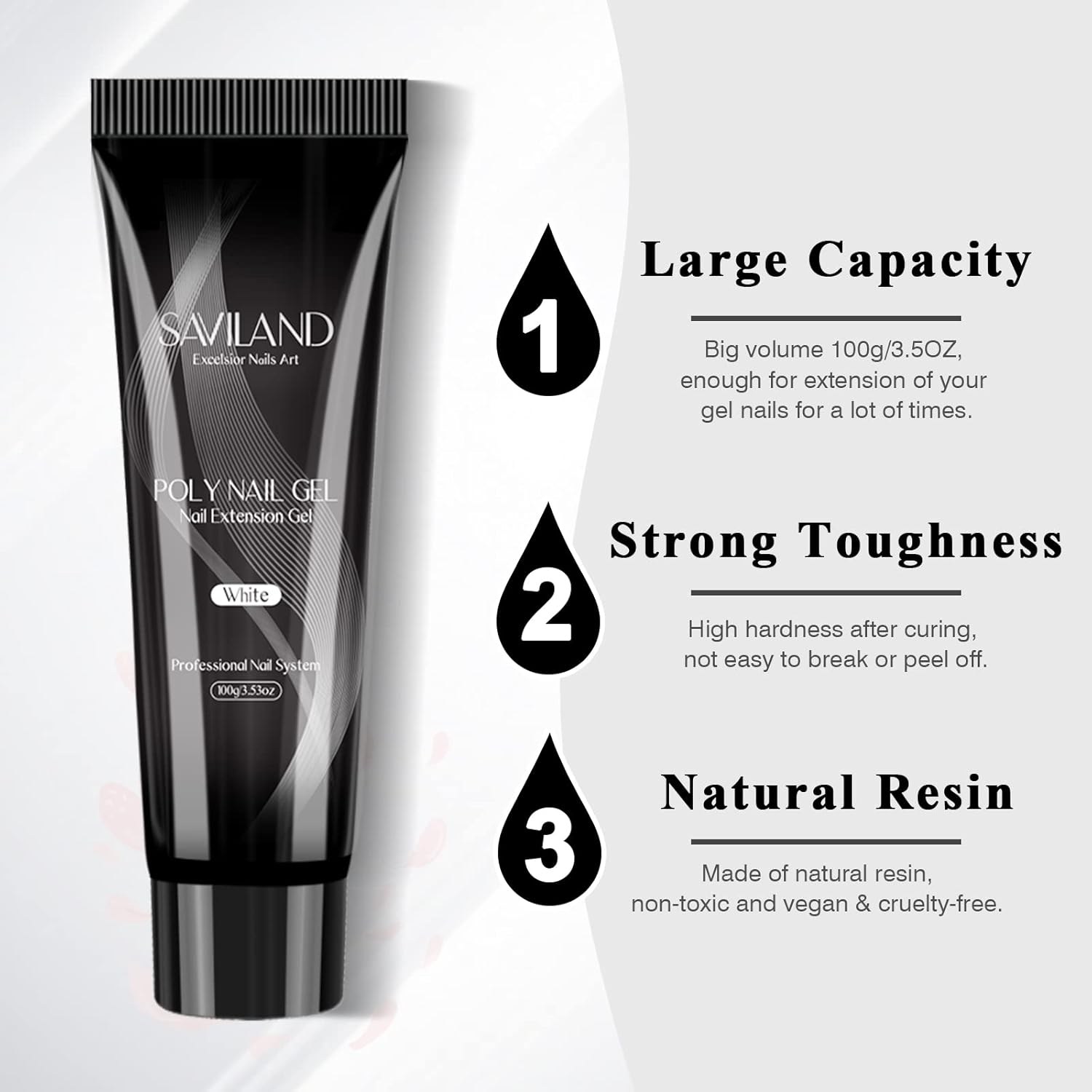 - π· SAVILAND WHITE POLY NAIL GEL-Saviland 100g/3.5oz white poly extension gel with popular classic color, can do nail extension, poly gel nails, nail enhancement, nail art, stick sequins or decorations, etc. 100g super large capacity, valuable, and long service life. It is very suitable for professional nail salons and nail lovers who often make extension. Can mix with other colorful gel to create various and attractive nail art.