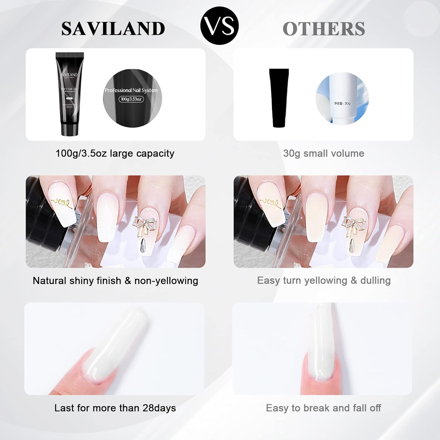 - π· LONG-LASTING & EXQUISITE PACKAGE-Saviland poly gel is durable, the finish effect from poly extension gel can last for more than 21 days. And the packing is high quality, soft hose, sealed and no leaking, easy to squeeze out. And it is also an ideal gift for yourself or your friends who are keen on doing nail designs.