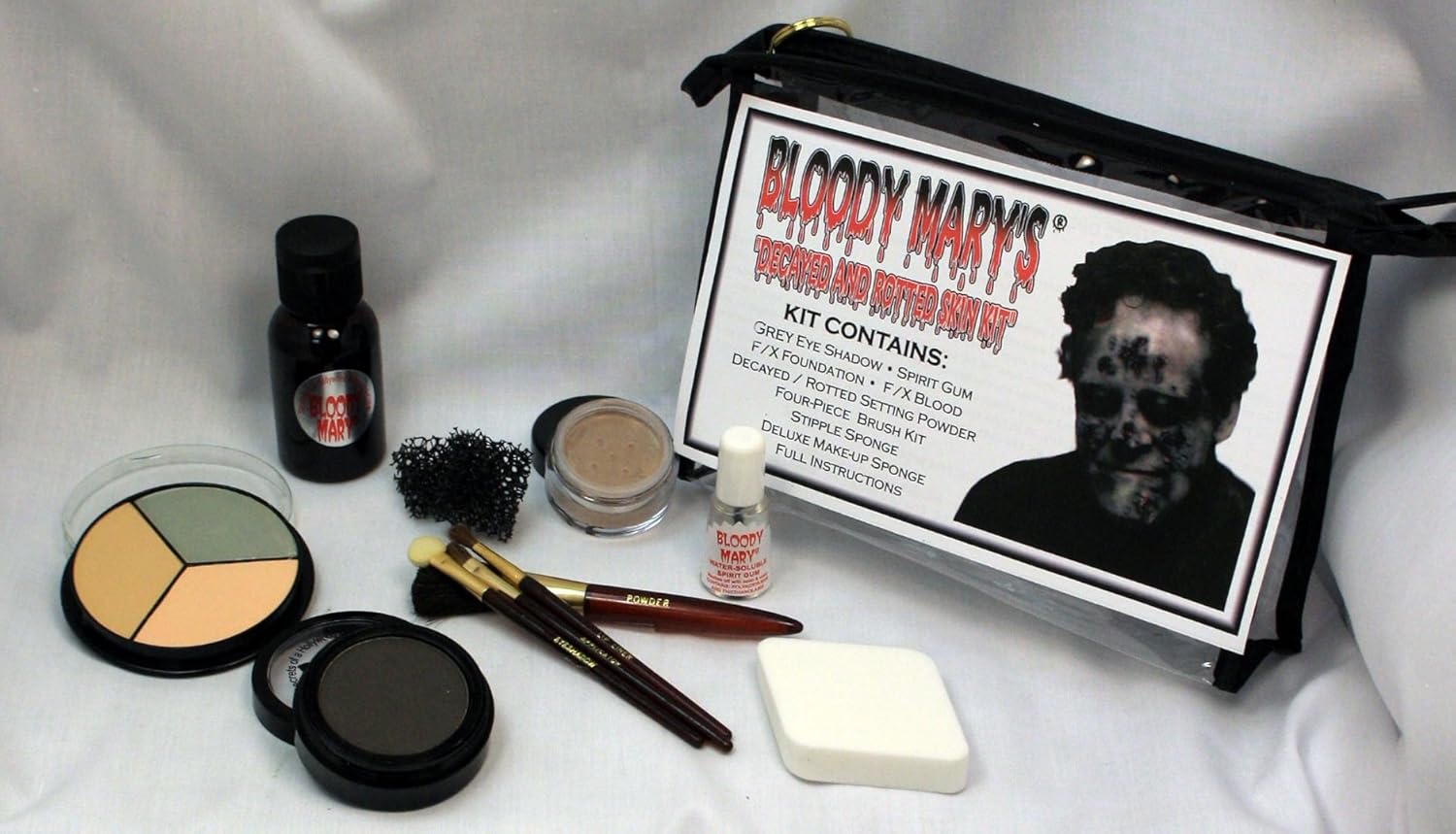Decayed & Rotted Skin Special Effects Makeup Kit By Bloody Mary - Halloween Costume SFX Makeup - FX Foundation & Blood, Eye Shadow, Setting Powder, Stipple & Application Sponge, 4 Brushes & Spirit Gum