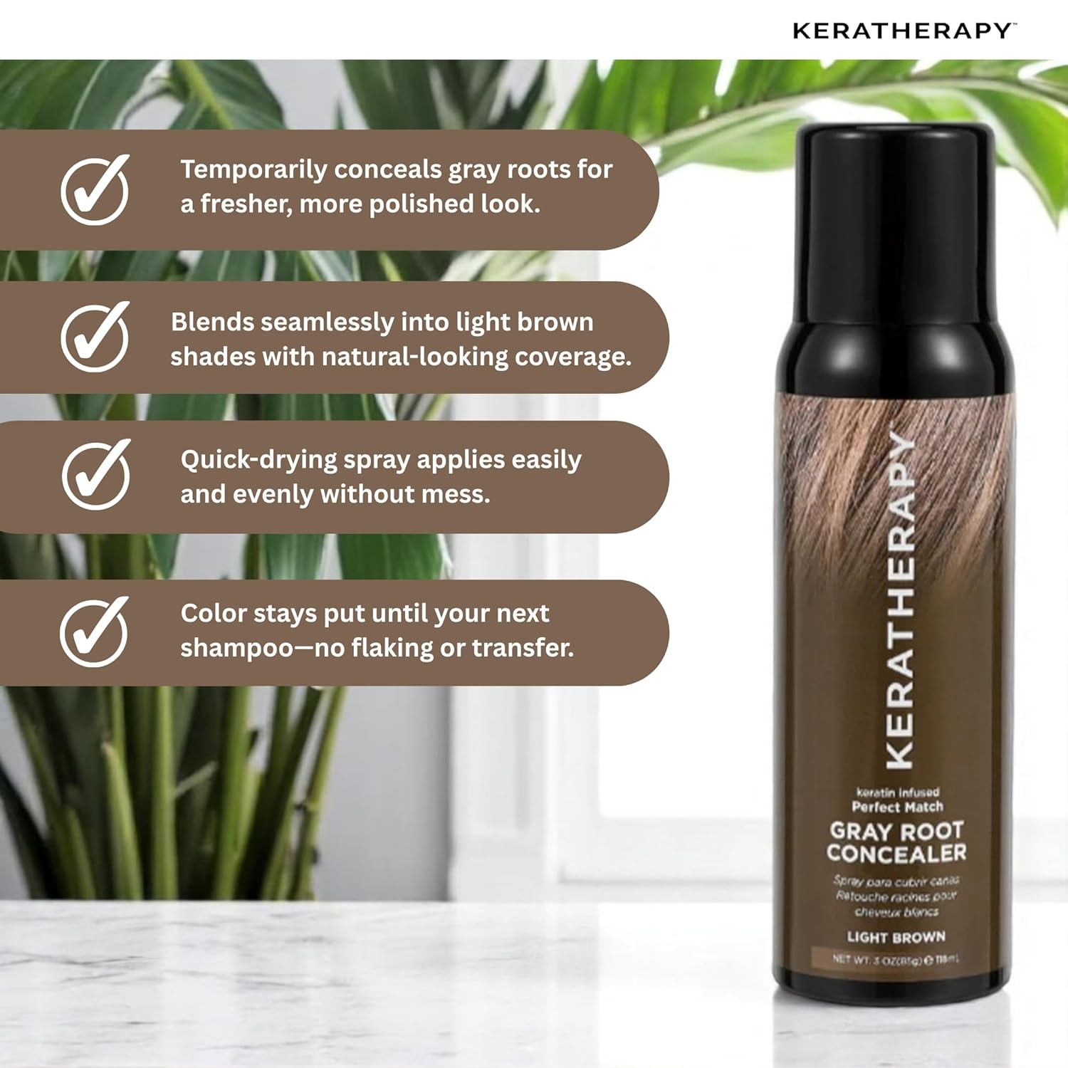 Keratherapy Keratin Infused Perfect Match Gray Root Concealer Spray, Light Brown, 3 oz, 118ml - Root Cover Up Spray to Hide Gray Roots - Keratin Therapy Hair Darkening & Temporary Scalp Concealer