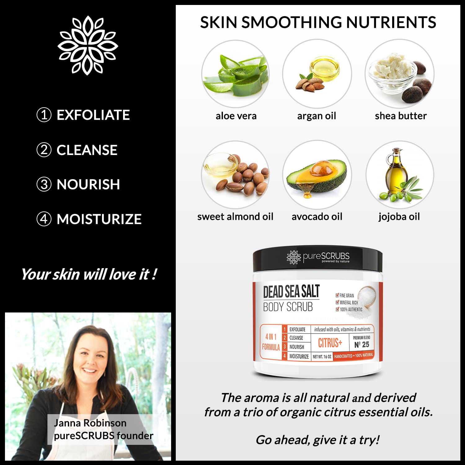 - GET ULTRA SMOOTH SKIN FAST - THIS WORKS! Our unique “4 in 1 Formula” does everything a body scrub should do and more - EXFOLIATE, CLEANSE, NOURISH & MOISTURIZE. Fine grain dead sea salt infused with essential oils, nutrients and skin softeners helps to smooth away rough, bumpy, and uneven textures to instantly reveal your true soft, healthy and radiant skin. You'll love the citrus aroma!